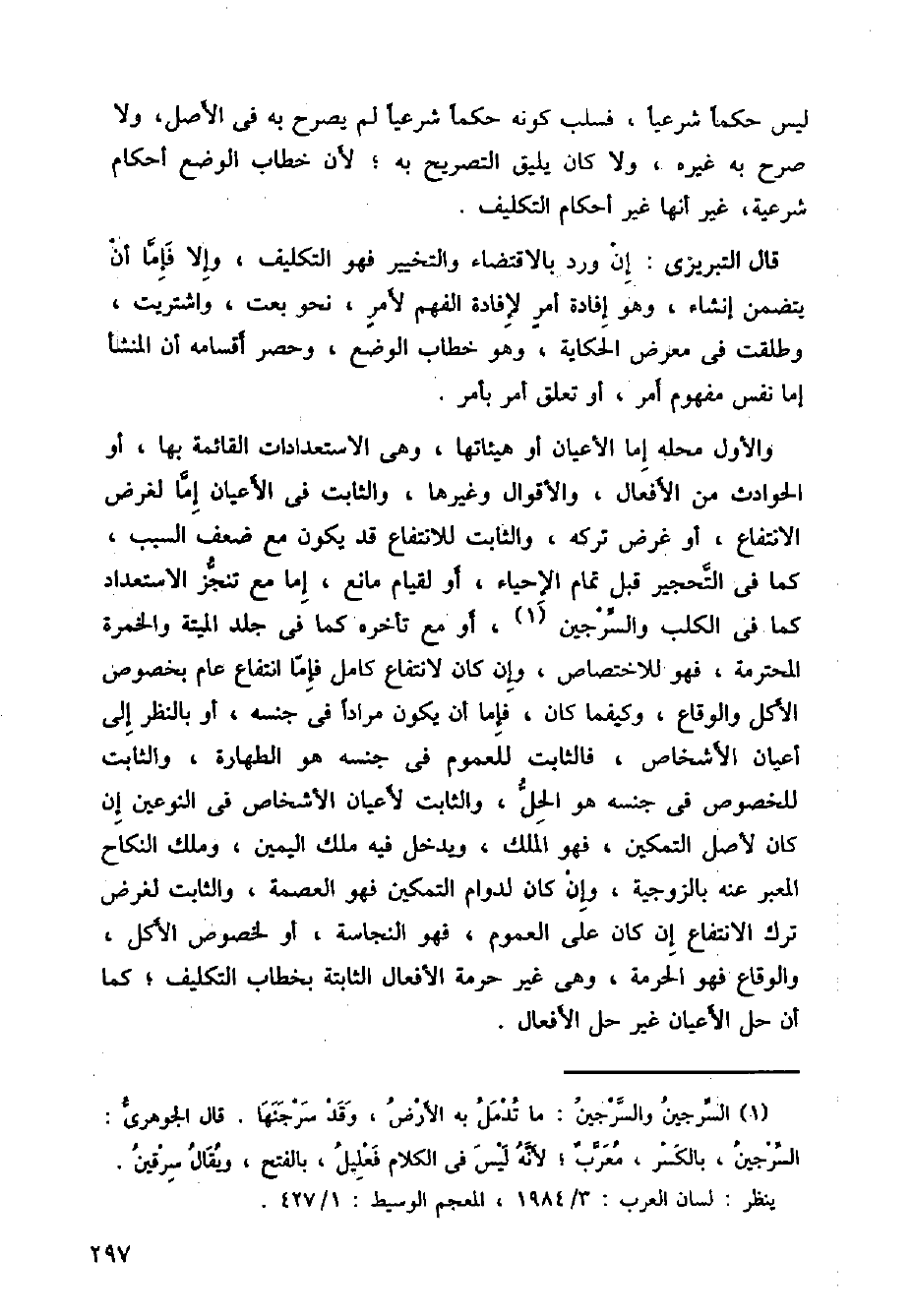 الأول محله إما الأعيان أو هيئاتها، وهي الاستعدادات القائمة بها، أو الحوادث من الأفعال، والأقوال وغيرها، والثابت في الأعيان إما لغرض الانتفاع، أو غرض تركه، والثابت للانتفاع قد يكون محض ضعف السبب، كما في التحجير قبل تمام الإحياء، أو لقيام مانع، إما مع تنجز الاستعداد كما في الكلب والسرجين، أو مع تأخره كما في جلد الميتة والخمرة المحترمة، فهو للإختصاص، وإن كان لانتفاع كامل فإما انتفاع عام بخصوص الأكل والوقاع، وكيفما كان، فإما أن يكون مرادا في جنسه، أو بالنظر إلى أعيان الأشخاص، فالثابت للعموم في جنسه هوا لطهارة، والثابت للخصوص في جنسه هو الحل، والثابت لأعيان الأشخاص في النوعين إن كان لأصل التمكين، فهو الملك، ويدخل فيه ملك اليمين، وملك النكاح المعبر عنه بالزوجية، وإن كان لدوام التمكين فهو العصمة، والثابت لغرض ترك الانتفاع إن كان على العموم، فهو النجاسة، أو لخصوص الأكل، والوقاع فهو الحرمة، وهي غر حمة الأفعال الاثبتة بخطاب التكليف، كما أن حل الأعيان غير حل الأفعال.