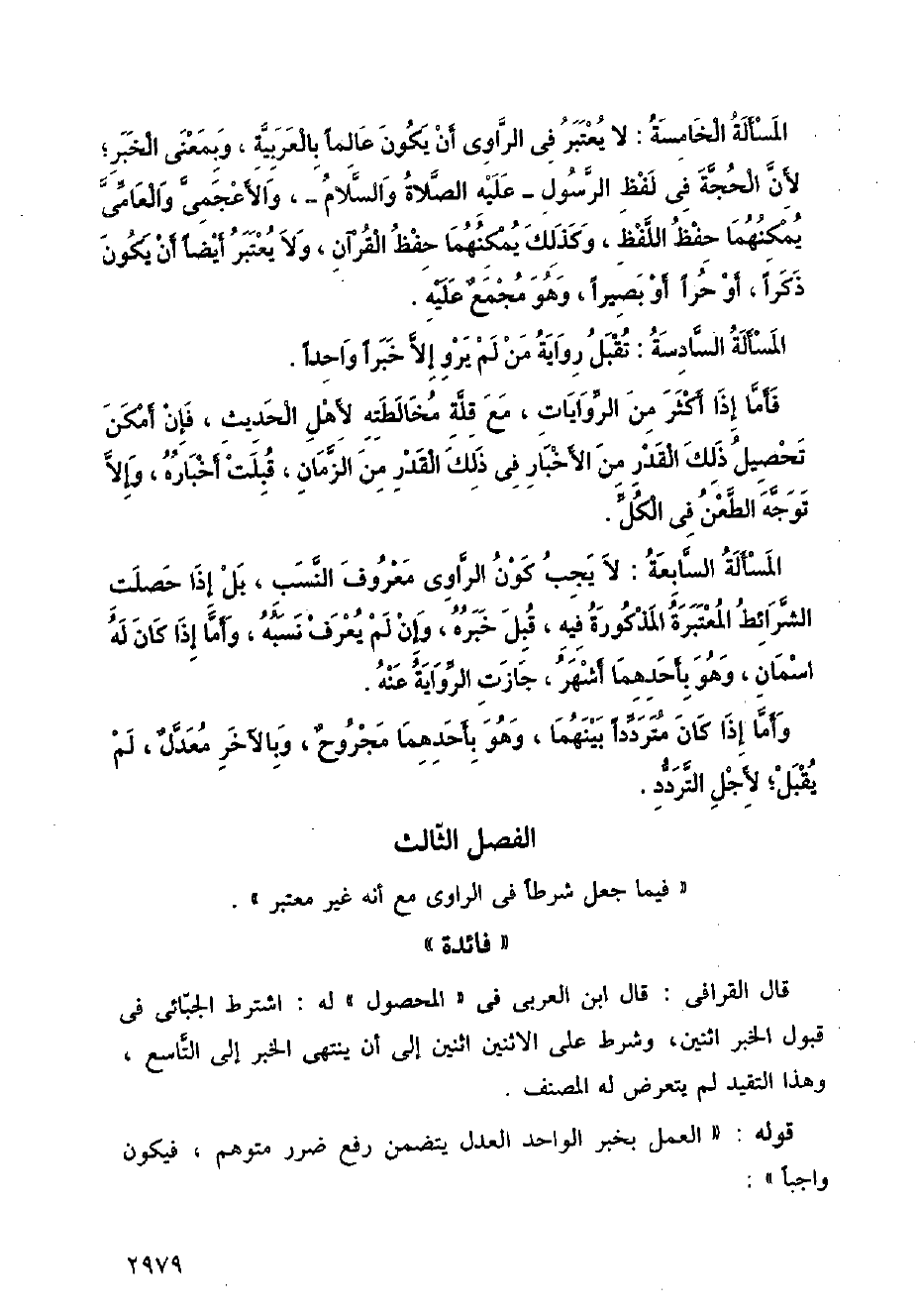 المسألة الخامسة: لا يعتبر في الراوي أن يكون عالمًا بالعربية، وبمعنى الخبر؛ لأن الحجة في لفظ الرسول - صلى الله عليه وسلم -، والأعجمي والعامي يمكنهما حفظ اللفظ، وكذلك يمكنهما حفظ القرآن، ولا يعتبر أيضًا أن يكون ذكرًا، أو حرًا أو بصيرًا، وهو مجمع عليه.