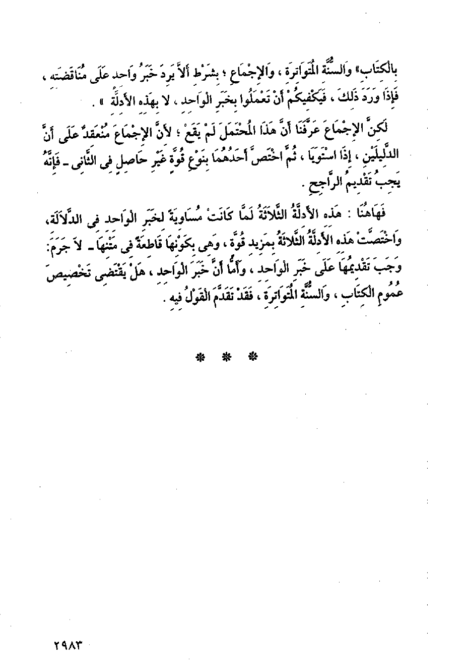 بالكتاب) والسنة المتواترة، والإجماع؛ بشرط أن لا يرد خبر واحد على مناقضته، فإذا ورد ذلك، فيكفيكم أن تعملوا بخبر الواحد، لا بهذه الأدلة).