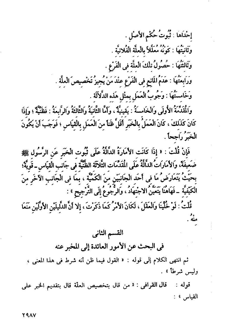 والمقدمة الأولى والخامسة: يقينية، وأما الثانية والثالثة والرابعة: فظنية؛ وإذا كان كذلك، كان العمل بالخبر أقل ظنًا من العمل بالقياس؛ فوجب أن يكون الخبر راجحًا.