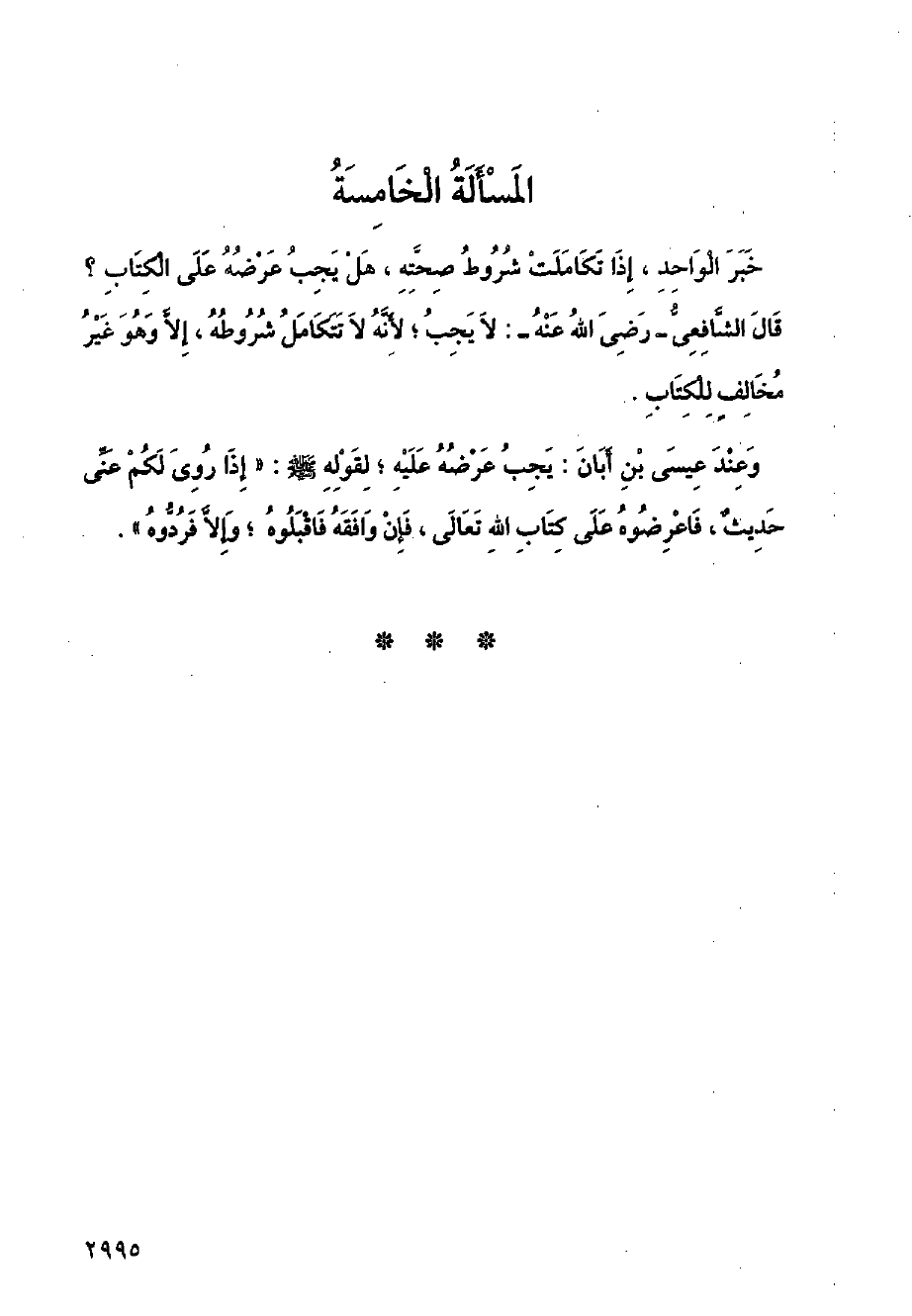 خبر الواحد، إذا تكاملت شروط صحته، هل يجب عرضه على الكتاب؟ قال الشافعي- رضي الله عنه -: لا يجب؛ لأنه لا تتكامل شروطه، إلا وهو غير مخالف للكتاب.