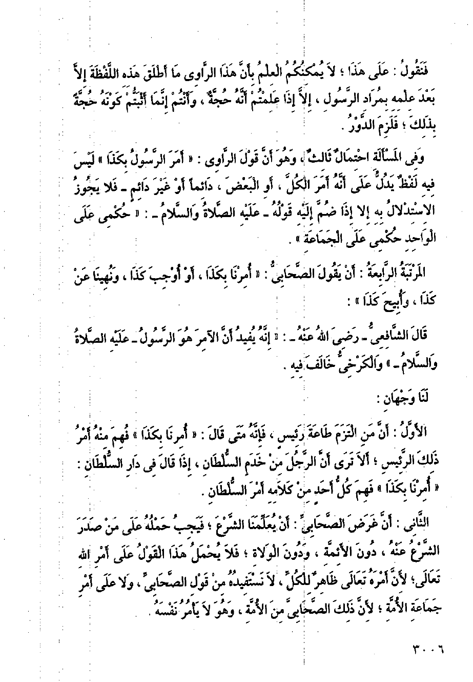 الثاني: أن غرض الصحابي: أن يعلمنا الشرع؛ فيجب حمله على من صدر الشرع عنه، دون الأئمة، ودون الولاة؛ فلا يحمل هذا القول على أمر الله تعالى؛ لأن أمره تعالى ظاهر للكل، لا نستفيده من قول الصحابي، ولا على أمر جماعة الأمة؛ لأن ذلك الصحابي من الأمة، وهو لا يأمر نفسه.