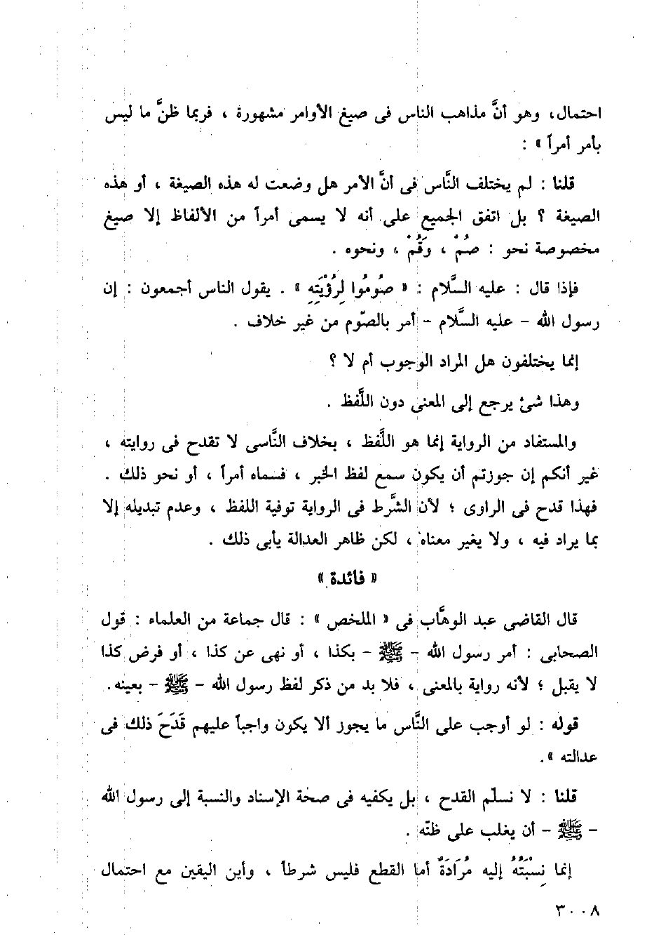 قال القاضي عبد الوهاب في (الملخص): قال جماعة من العلماء: قول الصحابي: أمر رسول الله - صلى الله عليه وسلم - بكذا، أو نهى عن كذا، أو فرض كذا لا يقبل؛ لأنه رواية بالمعنى، فلا بد من ذكر لفظ رسول الله - - صلى الله عليه وسلم - بعينه.