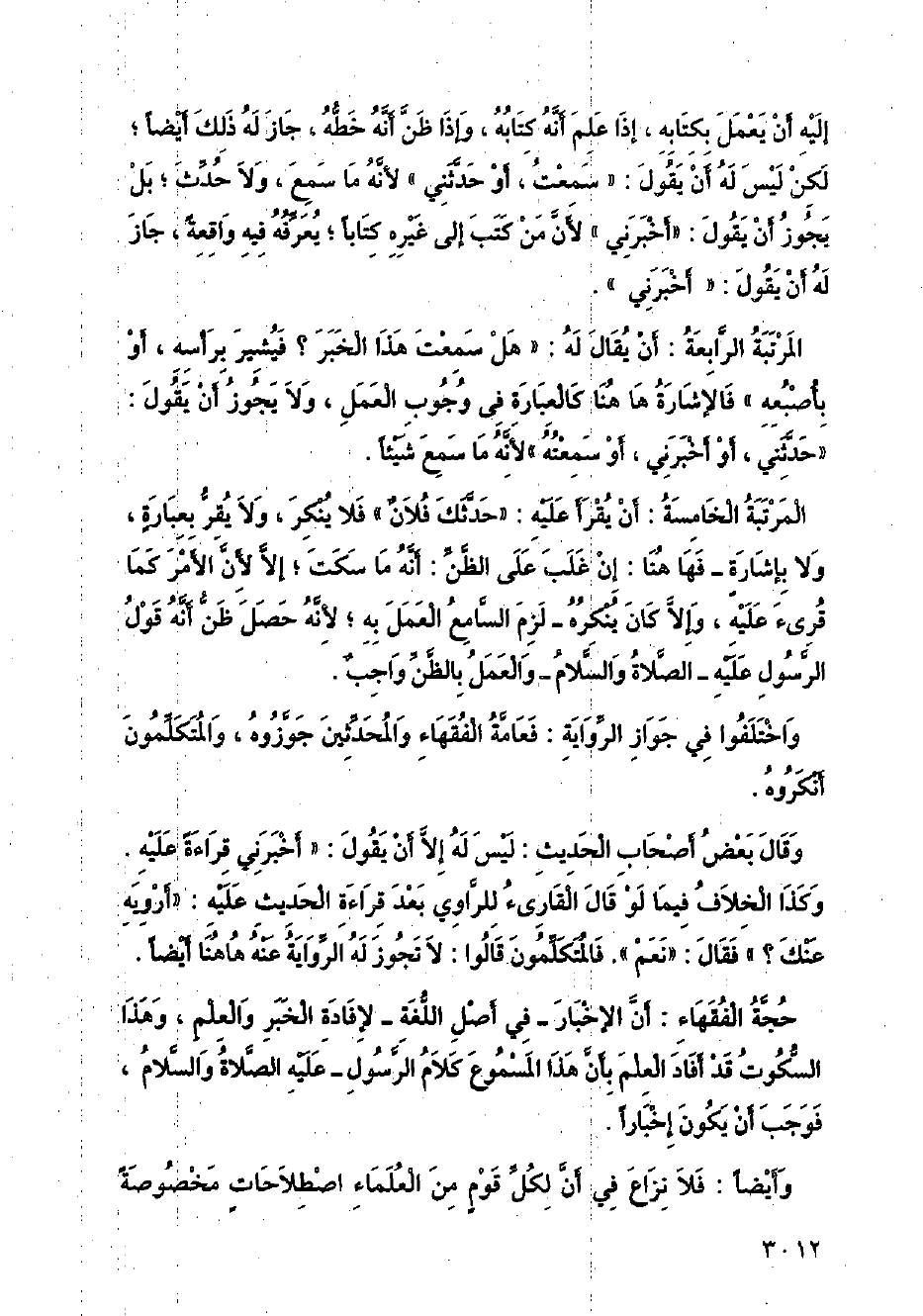 المرتبة الرابعة: أن يقال له: (هل سمعت هذا الخبر؟ فيشير برأسه، أو بأصبعه) فالإشارة ها هنا كالعبارة في وجوب العمل، ولا يجوز أن يقول: (حدثني، أو أخبرني، أو سمعته) لأنه ما سمع شيئا.