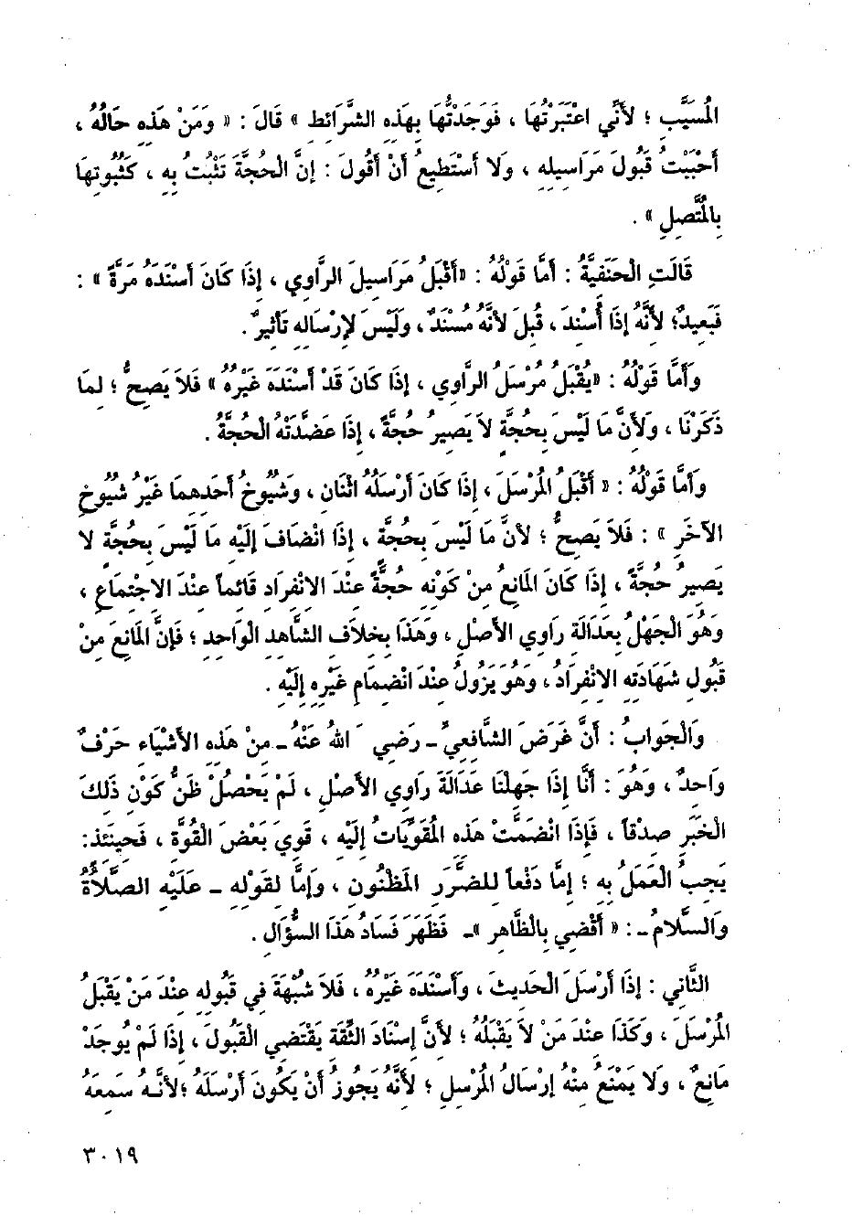 المسيب؛ لأني اعتبرتها، فوجدتها بهذه الشرائط) قال: (ومن هذه حاله، أحببت قبول مراسليه، ولا أستطيع أن أقول: إن الحجة تثبت به، كثبوتها بالمتصل).