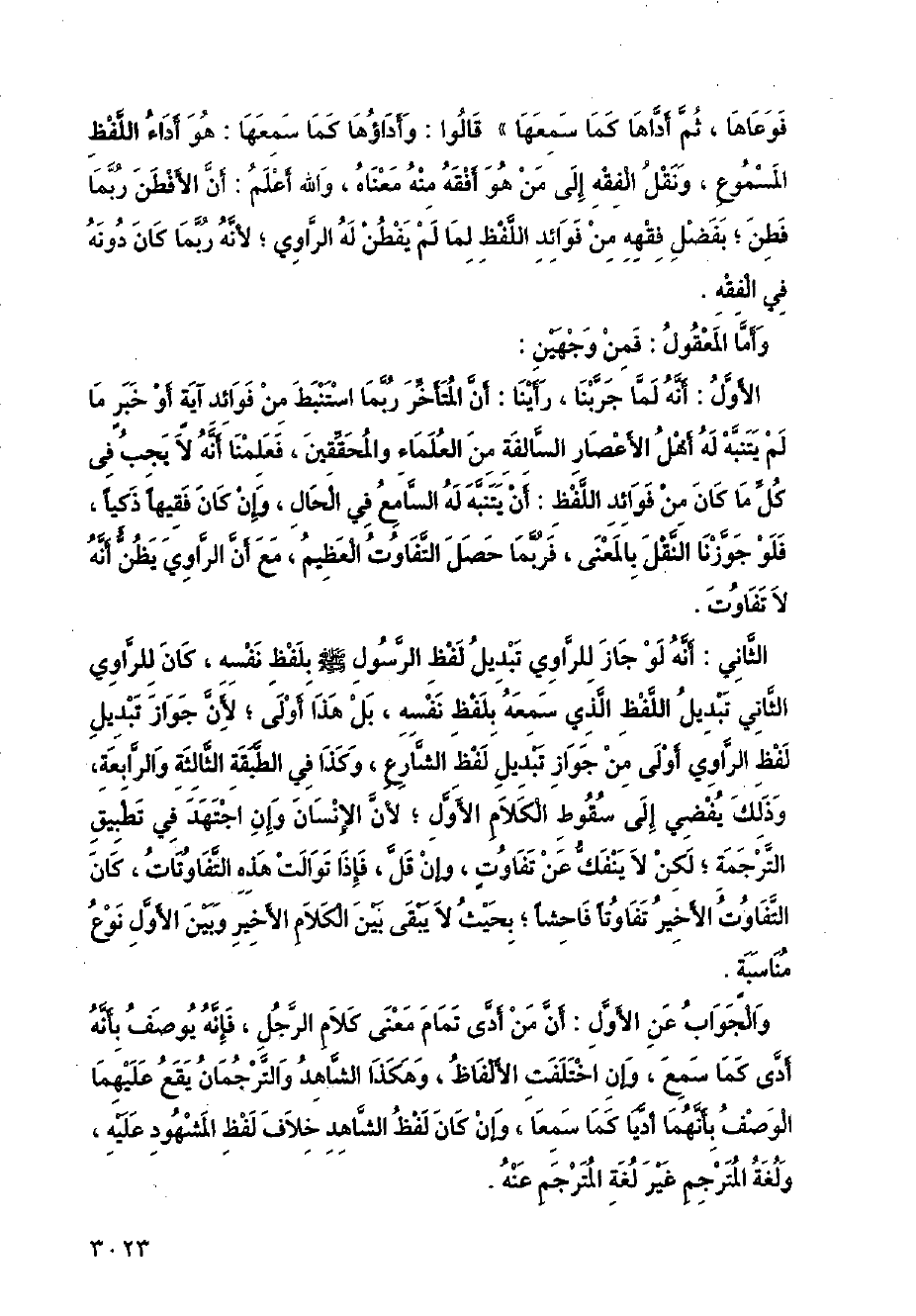 الأول: أنه لما جربنا، رأينا: أن المتأخر ربما استنبط من فوائد آية أو خبر ما لم يتنبه له أهل الأعصار السالفة من العلماء والمحققين، فعلمنا أنه لا يجب في كل ما كان من فوائد اللفظ: أن يتنبه له السامع في الحال، وإن كان فقيهًا ذكيًا، فلو جوزنا النقل بالمعنى، فربما حصل التفاوت العظيم، مع أن الراوي يظن أنه لا تفاوت.