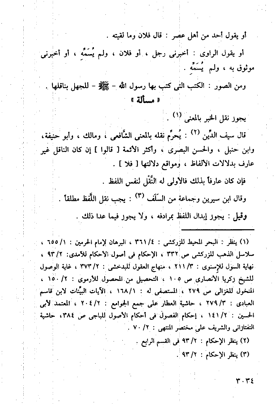 قال سيف الدين: يحرم نقله بالمعنى الشافعي، ومالك، وأبو حنيفة، وابن حنبل، والحسن البصري، وأكثر الأئمة [قالوا] إن كان الناقل غير عارف بدلالات الألفاظ، ومواقع دلالتها [فلا].