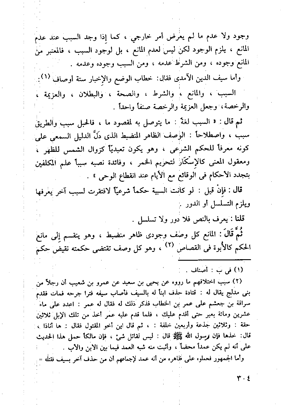 ثم قال: ((السبب لغة: ما يتوصل به لمقصود ما، فالحبل سبب والطريق سبب، اصطلاحا: الوصف الظاهر المنضبط الذي دل الدليل السمعي على كونه معرفا للحكم الشرعي، وهو يكون تعبديا كزوال الشمس للظهر، ومعقول المعنى كالإسكار لتحريم الخمر، وفائدة نصبه سببا علم المكلفين تجدد الأحكام في الوقائع مع الأيام عند انقطاع الوحي)).