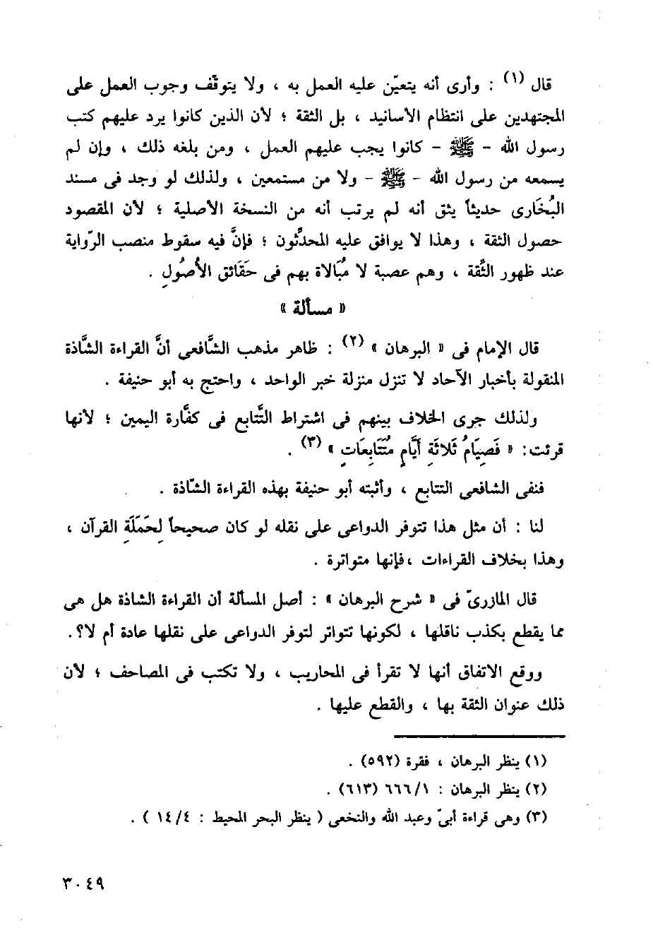 قال المازري في (شرح البرهان): أصل المسألة أن القراءة الشاذة هل هي مما يقطع بكذب ناقلها، لكونها تتواتر لتوفر الدواعي على نقلها عادة أم لا؟.