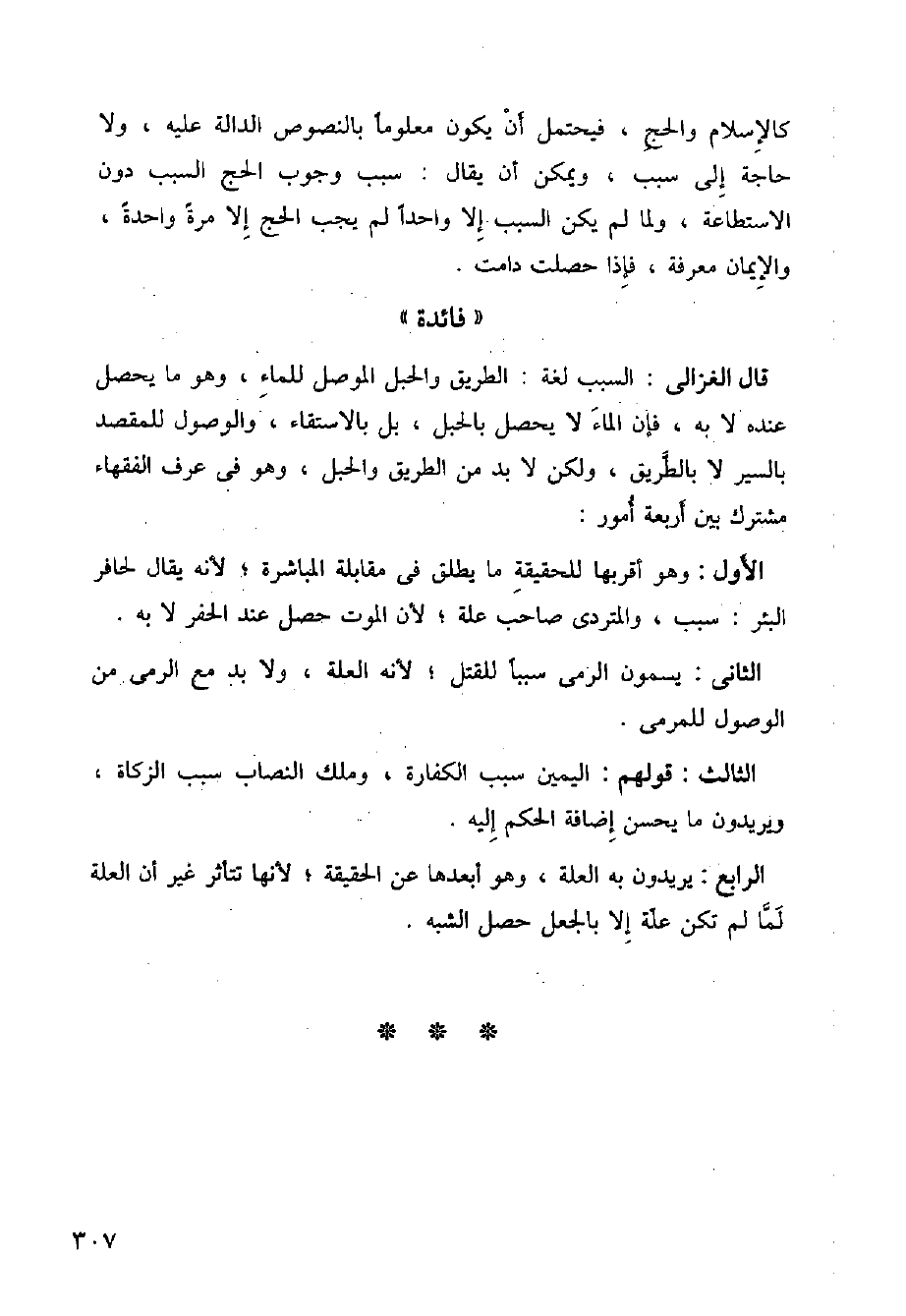 الأول: وهو أقربها للحقيقة ما يطلق في مقابلة المباشرة، لأنه يقال لحافر البئر: سبب، والمتردي صاحب علة، لأن الموت حصل عند الحفر لا به.