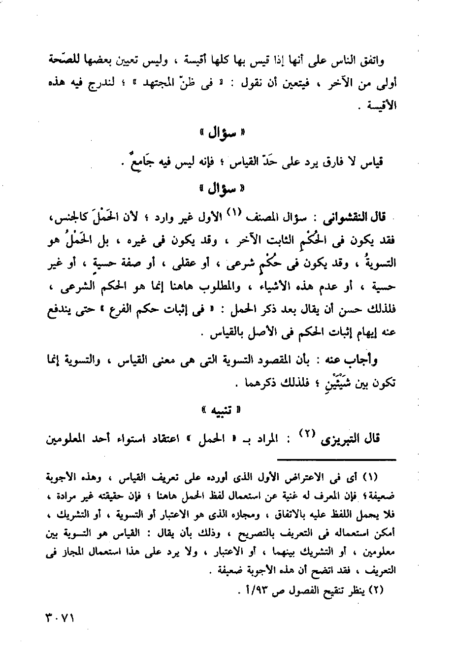 قال النقشواني: سؤال المصنف الأول غير وارد؛ لأن الحمل كالجنس، فقد يكون في الحكم الثابت الآخر، وقد يكون في غيره، بل الحمل هو التسوية، وقد يكون في حكم شرعي، أو عقلي، أو صفة حسية، أو غير حسية، أو عدم هذه الأشياء، والمطلوب هاهنا إنما هو الحكم الشرعي، فلذلك حسن أن يقال بعد ذكر الحمل: (في إثبات حكم الفرع) حتى يندفع عنه إيهام إثبات الحكم في الأصل بالقياس.