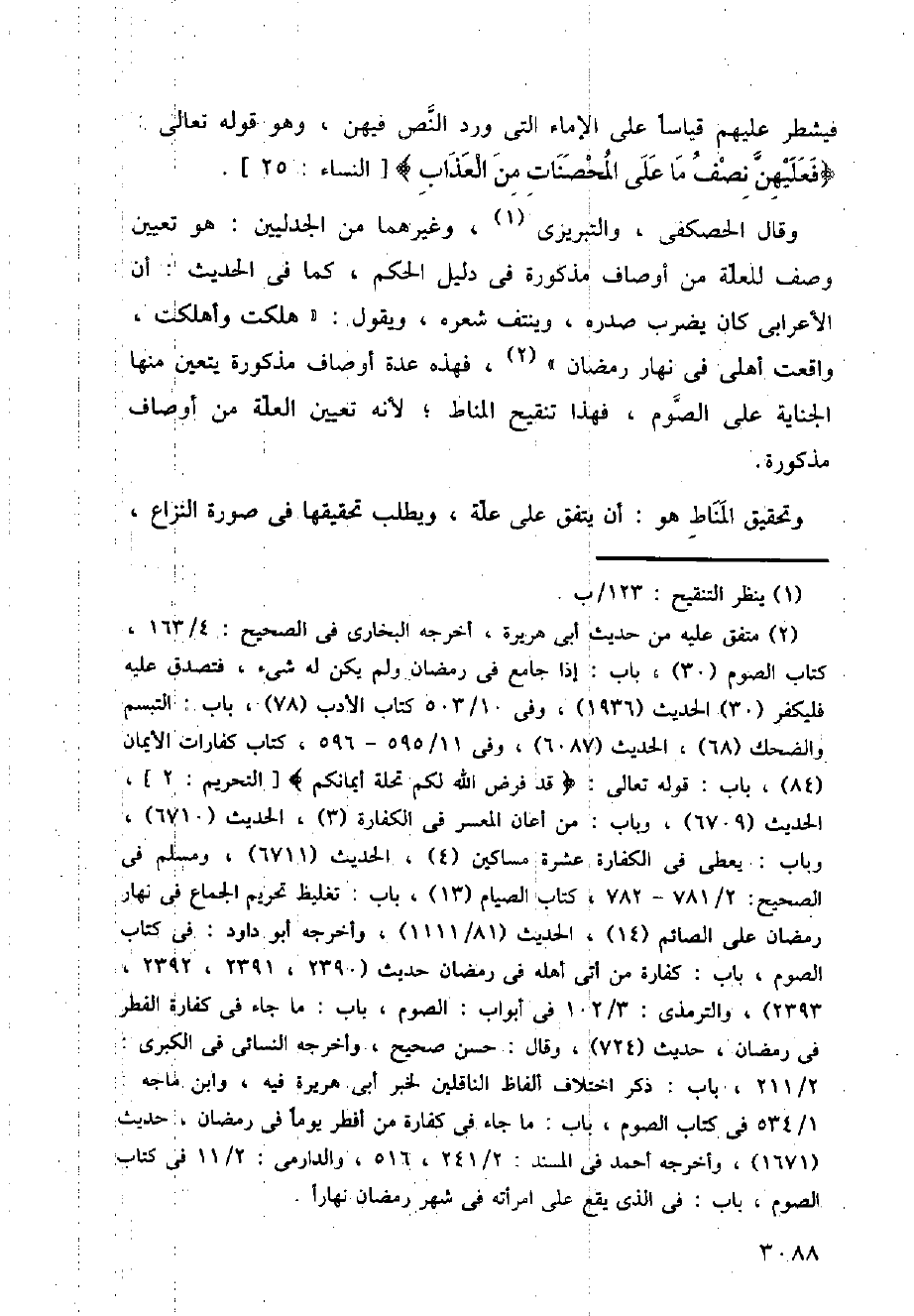 وقال الحصكفى، والتبريزي، وغيرهما من الجدليين: هو تعيين وصف للعلة من أوصاف مذكورة في دليل الحكم، كما في الحديث: أن الأ'رابي كان يضرب صدره، وينتف شعره، ويقول: (هلكت وأهلكت، واقعت أهلي في نهار رمضان)، فهذه عدة أوصاف مذكورة يتعين منها الجناية على الصوم، فهذا تنقيح المناط؛ لأنه تعيين العلة من أوصاف مذكورة.