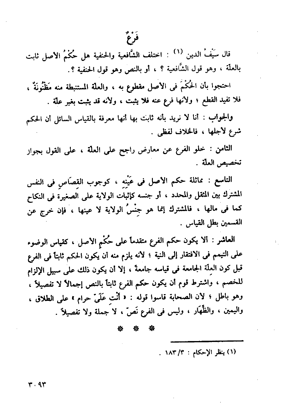 قال سيف الدين: اختلف الشافعية والحنفية هل حكم الأصل ثابت بالعلة، وهو قول الشافعية؟، أو بالنص وهو قول الحنفية؟.