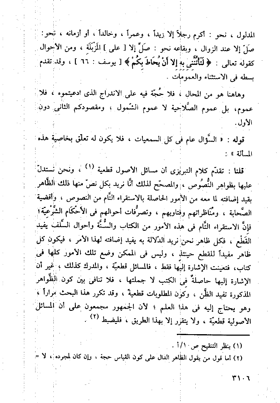 قلنا: تقدم كلام التبريزي أن مسائل الأصول قطعية، ونحن نستدل عليها بظواهر النصوص، والمصحح لذلك أنا نريد بكل نص منها ذلك الظاهر بقيد إضافته لما معه من الأمور الحاصلة بالاستقراء التام من النصوص، وأقضية الصحابة، ومناظراتهم وفتاويهم، وتصرفات أحوالهم في الأحكام الشرعية؛ فإن الاستقراء التام في هذه الأمور من الكتاب والسنة وأحوال السلف يفيد القطع، فكل ظاهر نحن نريد الدلالة به يفيد إضافته لهذا الأمر، فيكون كل ظاهر مفيدًا للقطع حينئذ، وليس في الممكن وضع تلك الأمور كلها في كتاب، فتعينت الإشارة إليها فقط، فالمسائل قطعية، والمدرك كذلك، غير أن الإشارة إليها حاصلة في الكتب لا جملتها، فلا تنافى بين كون الظواهر المذكورة تفيد الظن، وكون المطلوبات قطعية، وقد تكرر هذا البحث مرارًا، وهو يحتاج إليه في هذا العلم؛ لأن الجمهور مجمعون على أن المسائل الأصولية قطعية، ولا يتقرر إلا بهذا الطريق، فليضبط.