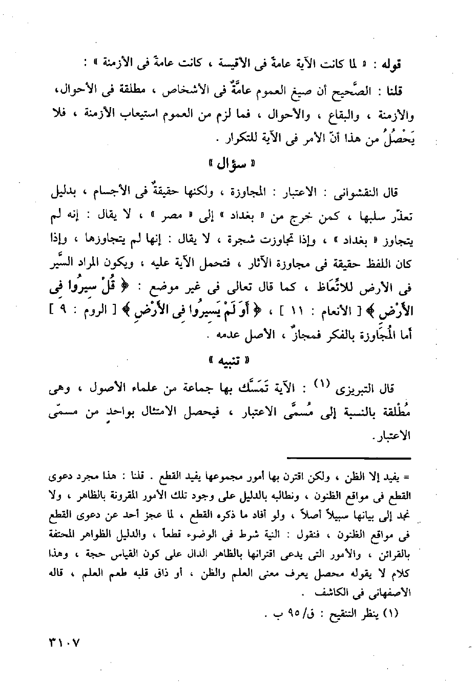 قال النقشواني: الاعتبار: المجاوزة، ولكنها حقيقة في الأجسام، بدليل تعذر سلبها، كمن خرج من (بغداد) إلى (مصر)، لا يقال: إنه لم يتجاوز (بغداد)، وإذا تجاوزت شجرة، لا يقال: إنها لم يتجاوزها، وإذا كان اللفظ حقيقة في مجاوزة الآثار، فتحمل الآية عليه، ويكون المراد السير في الأرض للاتعاظ، كما قال تعالى في غير موضع: {قل سيروا في الأرض} [الأنعام: 11]، {أو لم يسيروا في الأرض} [الروم: 9] أما المجاوزة بالفكر فمجازٌ، الأصل عدمه.