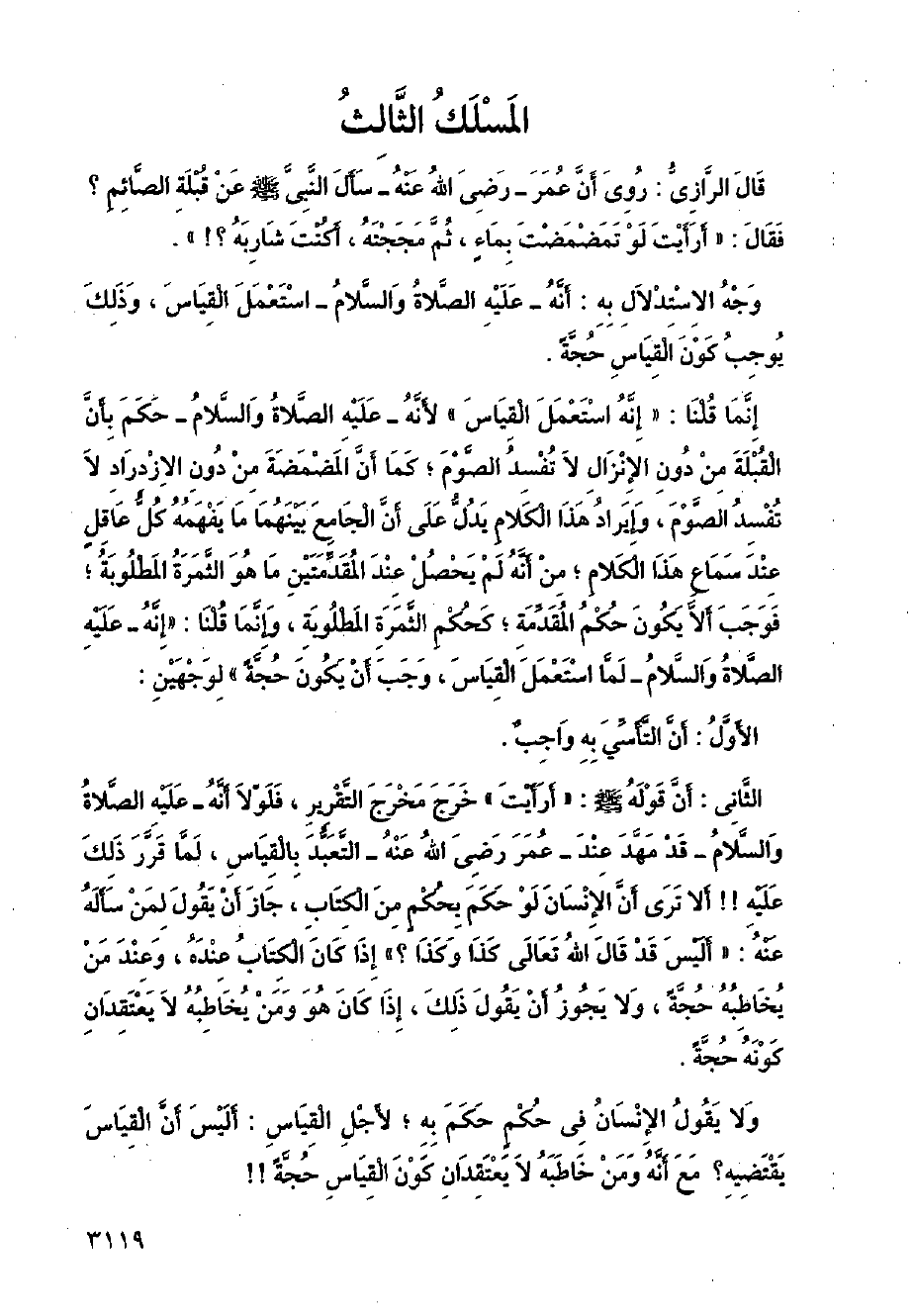 الثاني: أن قوله - صلى الله عليه وسلم -: (أرأيت) خرج مخرج التقرير، فلولا أنه - عليه الصلاة والسلام - قد مهد عند - عمر رضي الله عنه - التعبد بالقياس، لما قرر ذلك عليه!! ألا ترى أن الإنسان لو حكم بحكم من الكتاب، جاز أن يقول لمن سأله عنه: (أليس قد قال الله تعالى كذا وكذا؟) إذا كان الكتاب عنده، وعند من يخاطبه حجة، ولا يجوز أن يقول ذلك، إذا كان هو ومن يخاطبه لا يعتقدان كونه حجة.