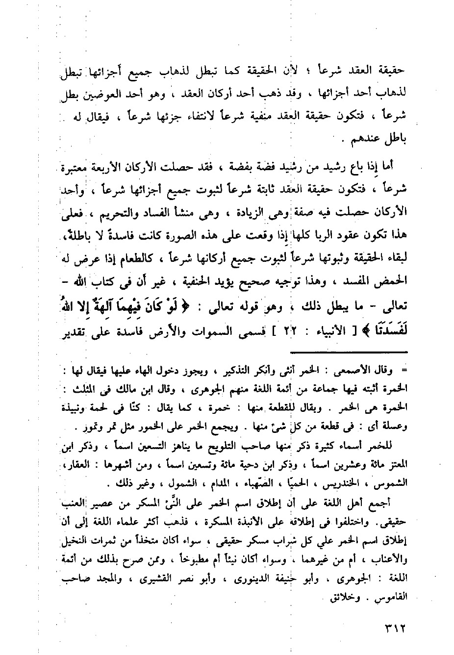 أما إذا باع رشيد من رشيد فضة بفضة، فقد حصلت الأركان الأربعة معتبرة شرعا، فتكون حقيقة العقد ثابتة شرعا لثبوت جميع أجزائها شرعا، وأحد الأركان حصلت فيه صفة وهي الزيادة، وهي منشأ الفساد ولاتحريم، فعلى هذا تكون عقود الربا كلها إذا وقعت على هذه الصورة كانت لفائدة لا باطلة، لبقاء الحقيقة وثبوتها شرعا لثبوت جميع أركانها شرعا، كالطعام إذا عرض له الحمض المفسد، وهذا توجيه صحيح يؤيد الحنفية، غير أن في كتاب الله - تعالى - ما يبطل ذلك، وهو قوله تعالى: ((لو كان فيهما آلهة إلا الله لفسدتا)) فسمى السموات والأرض فاسدة على تقدير
