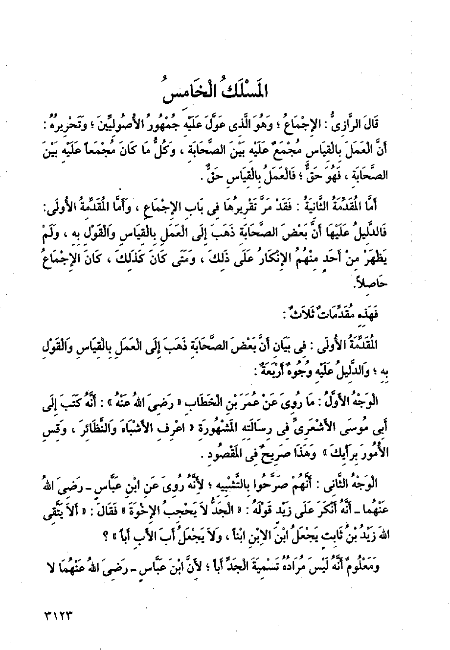 قال الرازي: الإجماع؛ وهو الذي عول عليه جمهور الأصوليين؛ وتحريره: أن العمل بالقياس مجمع عليه بين الصحابة، وكل ما كان مجمعًا عليه بين الصحابة، فهو حق؛ فالعمل بالقياس حق.