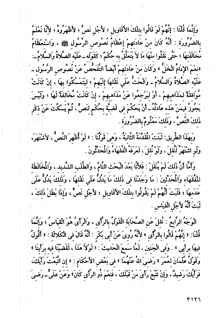 وإنما قلنا: إنهم لو قالوا بتلك الأقاويل؛ لأجل نص؛ لأظهروه؛ لأنا نعلم بالضرورة: أنه كان من عادتهم إعظام نصوص الرسول - صلى الله عليه وسلم -، واستعظام مخالفتها؛ حتى نقلوا منها ما لا يتعلق به حكم؛ كقوله - عليه الصلاة والسلام -: (نعم الإدام الخل) وكان من عاداتهم أيضًا التفحص عن نصوص الرسول - عليه الصلاة والسلام - والحث على نقلها إليهم؛ ليتمسكوا بها، إن كانت موافقة لمذاهبهم، أو ليرجعوا عن مذاهبهم، إن كانت مخالفة لها؛ وليس يجوز فيمن هذه عادته - أن يحكم في قضية بحكم لنص، ثم يسكت عن ذكر ذلك النص، وذلك معلوم بالضرورة.