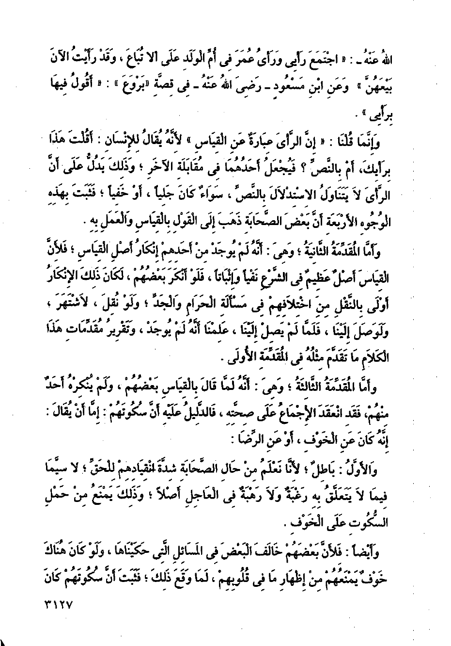 وإنما قلنا: (إن الرأي عبارة عن القياس) لأنه يقال للإنسان: أقلت هذا برأيك، أم بالنص؟ فيجعل أحدهما في مقابلة الآخر؛ وذلك بدل على أن الرأي لا يتناول الاستدلال بالنص، سواء كان جليًا، أو خفيًا؛ فثبت بهذه الوجوه الأربعة أن بعض الصحابة ذهب إلى القول بالقياس والعمل به.