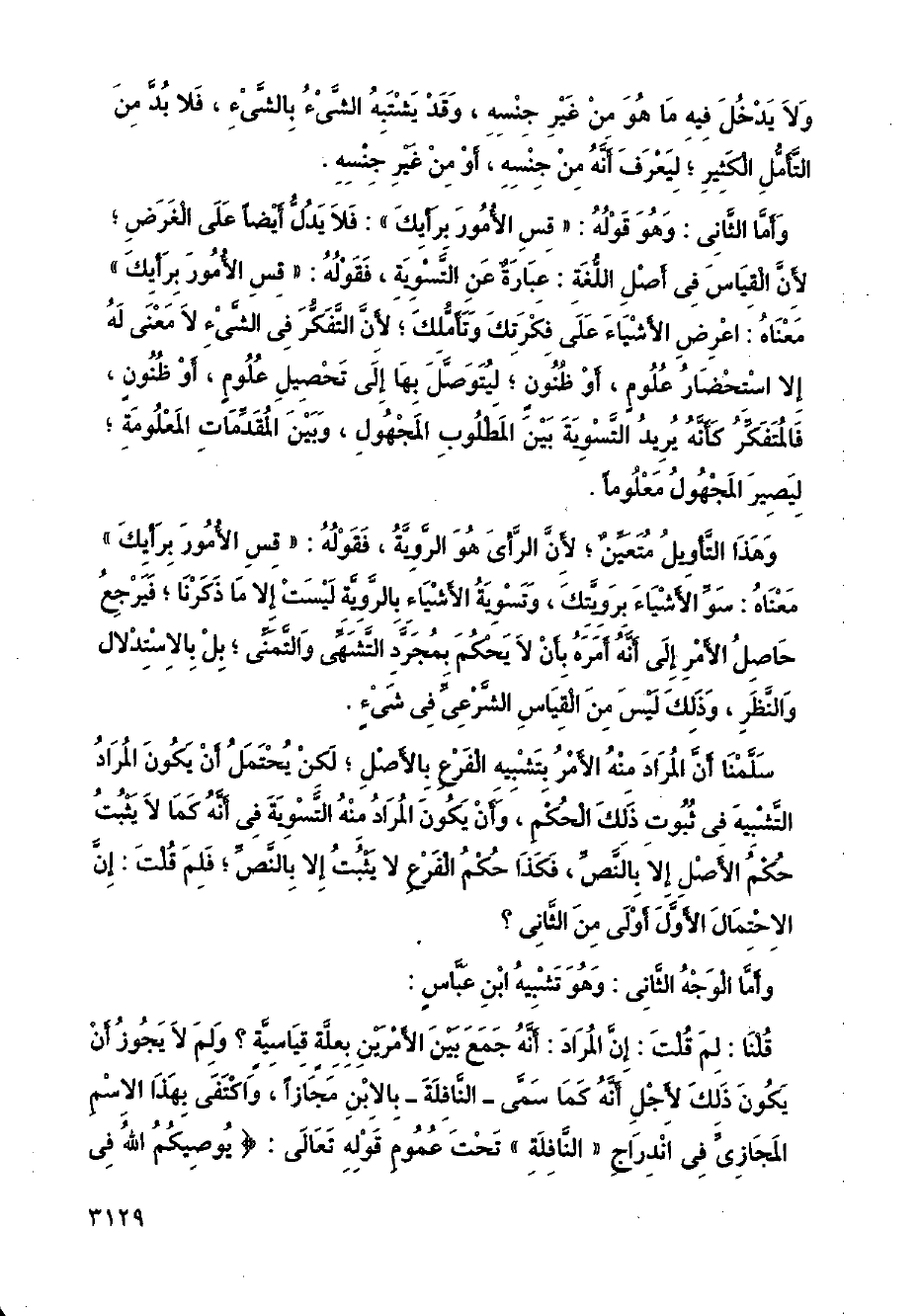 وأما الثاني: وهو قوله: (قس الأمور برأيك): فلا يدل أيضًا على الغرض؛ لأن القياس في أصل اللغة: عبارة عن التسوية، فقوله: (قس الأمور برأيك) معناه: اعرض الأشياء على فكرتك وتأملك؛ لأن التفكر في الشيء لا معنى له إلا استحضار علوم، أو ظنون؛ ليتوصل بها إلى تحصيل علوم، أو ظنون، فالمتفكر كأنه يريد التسوية بين المطلوب المجهول، وبين المقدمات المعلومة؛ ليصير المجهول معلومًا.