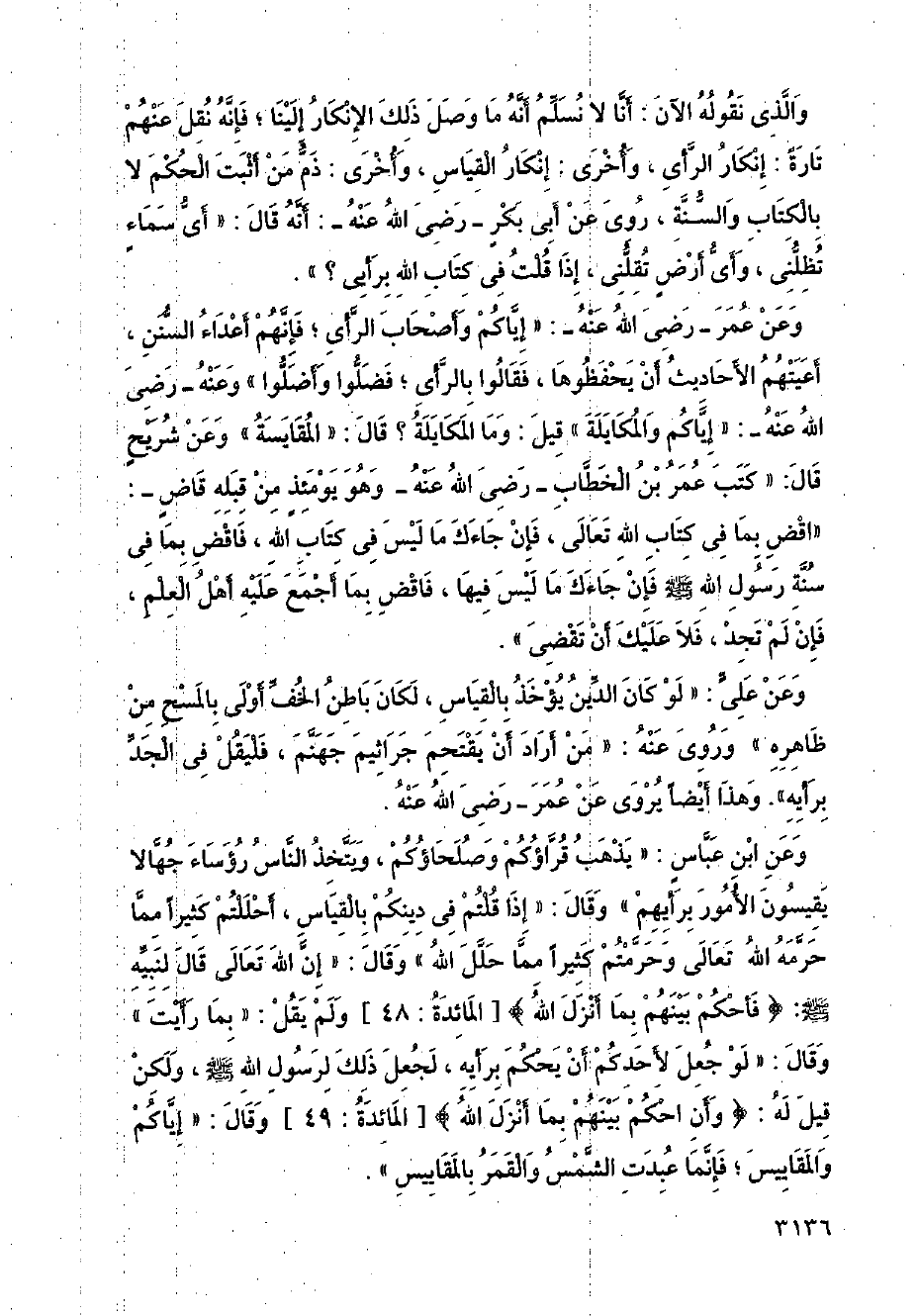 وعن عمر - رضي الله عنه -: (إياكم وأصحاب الرأي، فإنهم أعداء السنن، أعيتهم الأحاديث أن يحفظوها، فقالوا بالرأي؛ فضلوا وأضلوا) وعنه - رضي الله عنه -: (إياكم والمكايلة) قيل: وما المكايلة؟ قال: (المقايسة) وعن شريحٍ قال: (كتب عمر بن الخطاب - رضي الله عنه - وهو يومئذ من قبله قاضٍ -: (اقض بما في كتاب الله تعالى، فإن جاءك ما ليس في كتاب الله، فاقض بما في سنة رسول الله - صلى الله عليه وسلم - فإن جاءك ما ليس فيها، فاقض بما أجمع عليه أهل العلم، فإن لم تجد، فلا عليك أن تقضي).