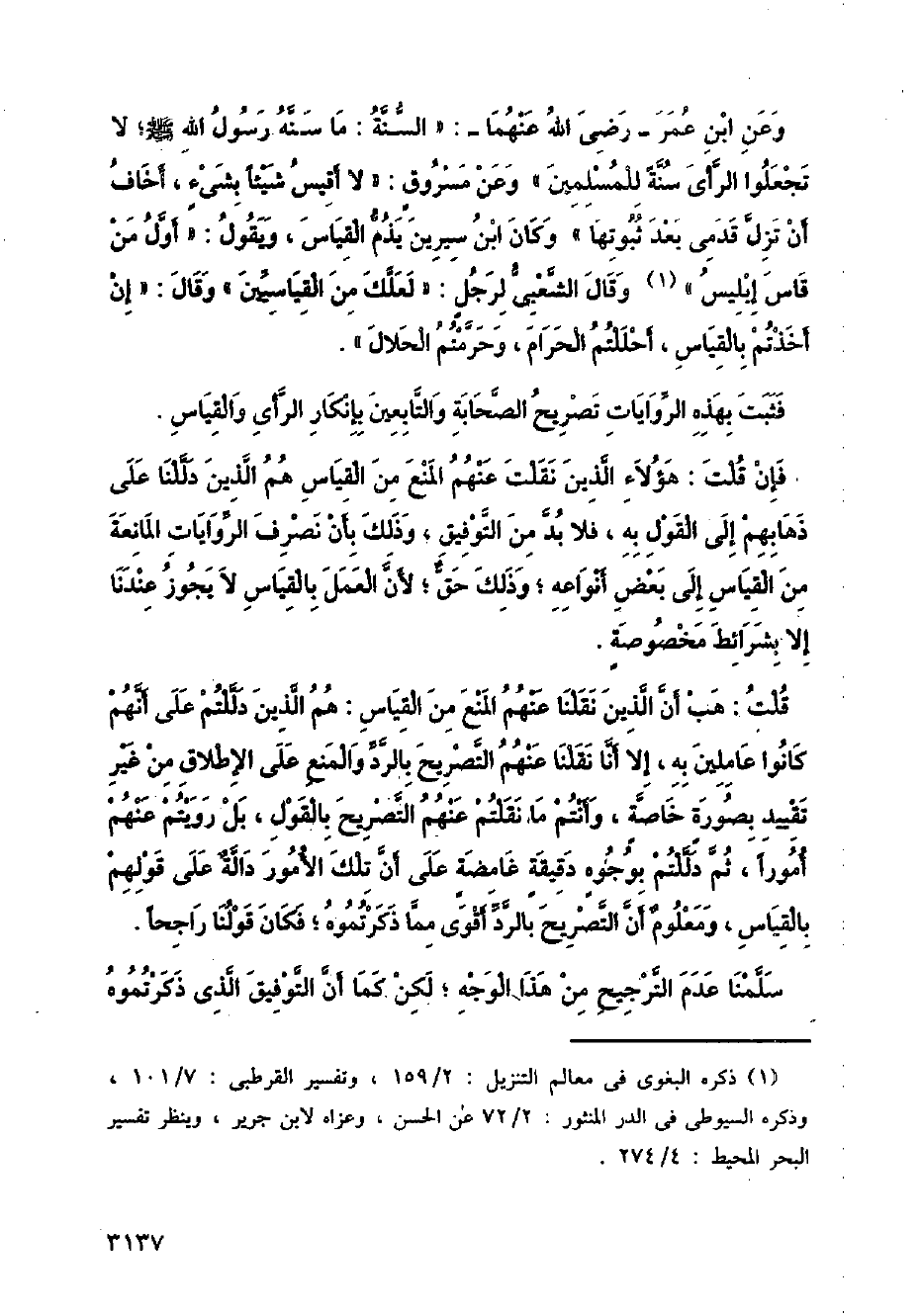 وعن ابن عمر - رضي الله عنهما -: (السنة: ما سنه رسول الله - صلى الله عليه وسلم -؛ لا تجعلوا الرأي سنة للمسلمين) وعن مسروق: (لا أقيس شيئًا بشيء، أخاف أن تزل قدمي بعد ثبوتها) وكان ابن سيرين يذم القياس، ويقول: (أول من قاس إبليس) وقال الشعبي لرجل: (لعلك من القياسيين) وقال: (إن أخذتم بالقياس، أحللتم الحرام، وحرمتهم الحلال).