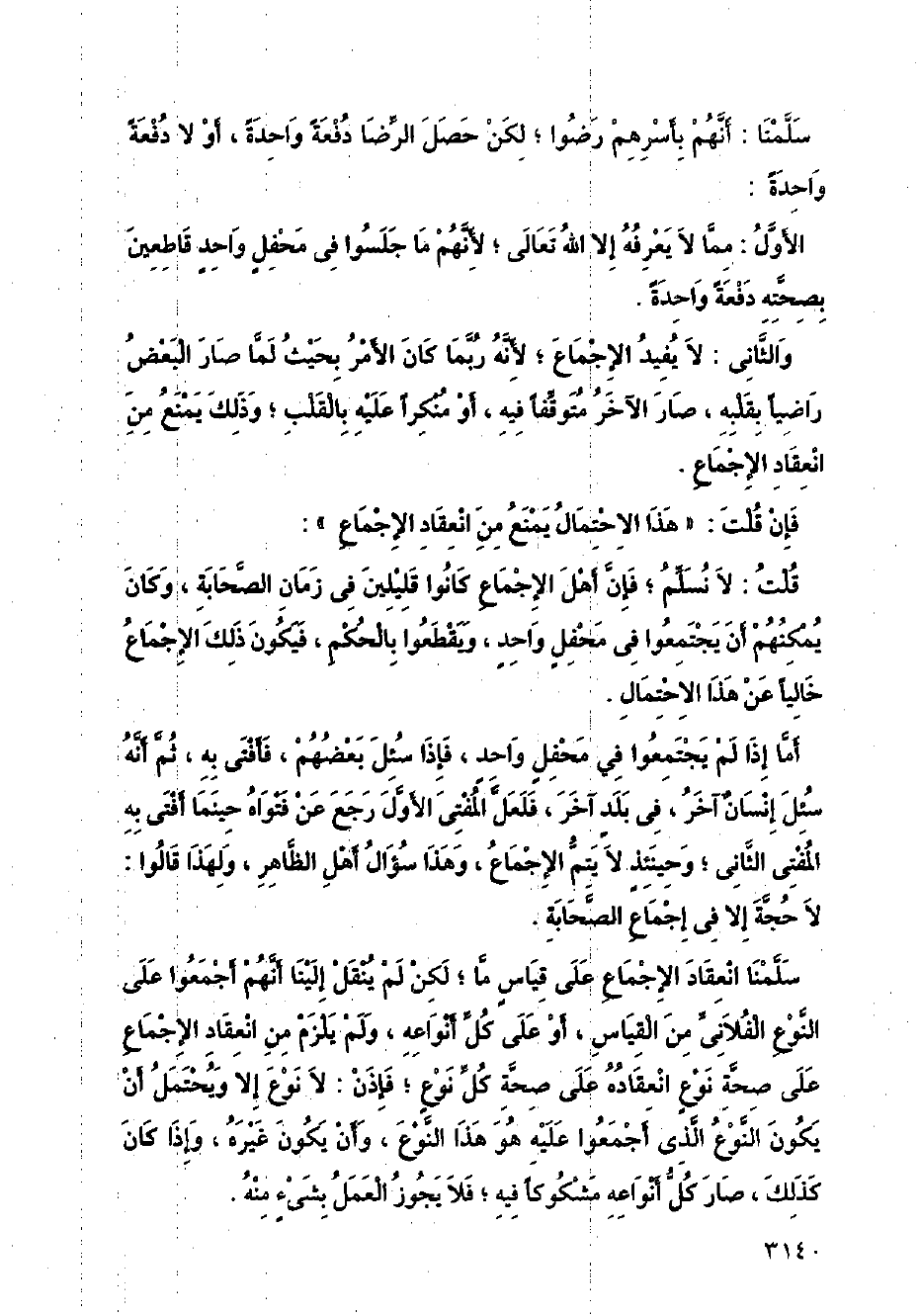 أما إذا لم يجتمعوا في محفل واحد، فإذا سئل بعضهم، فأفتى به، ثم أنه سئل إنسان آخر، في بلد آخر، فلعل المفتي الأول رجع عن فتواه حينما أفتى به المفتي الثاني؛ وحينئذ لا يتم الإجماع، وهذا سؤال أهل الظاهر، ولهذا قالوا: لا حجة إلا في إجماع الصحابة.
