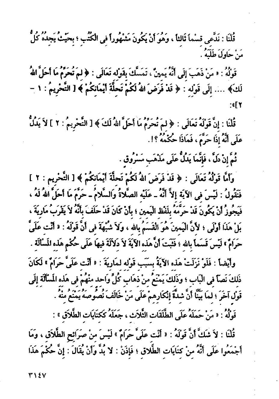 وأما قوله تعالى: {قد فرض الله لكم تحلة أيمانكم} [التحريم: 2] فنقول: ليس في الآية إلا أنه - عليه الصلاة والسلام - حرم ما أحل الله له، فيجوز أن يكون قد حرمه بلفظ اليمين؛ بأن كان قد حلف بأنه لا يقرب مارية، بل هذا أولى؛ لأن اليمين هو القسم بالله، ولا شبهة في أن قوله: (أنت عليَّ حرام) ليس قسمًا بالله؛ فثبت أن هذه الآية لا دلالة فيها على حكم هذه المسألة.