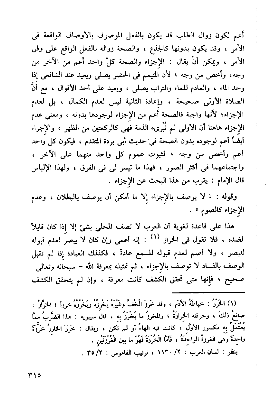 هذا على قاعدة لغويو أن العرب لاتوصف المحلى بشيء إلا إذا كان قابلا لضد، فلاتقول في الخراز: إنه أعمى وإن كان لا يبصر لعدم قبوله للبصر ولا أصم لعدم قبوله للسمع عادة، فكذلك العبادة إذا لم تقبل الوصف بالفساد لا توصف بالإجزاء، ثم تمثيله بمعرفة الله -سبحانه وتعالى- صحيح، فإنها متى تحقق الكشف كانت معرفة، وإن لم يتحقق الكشف
