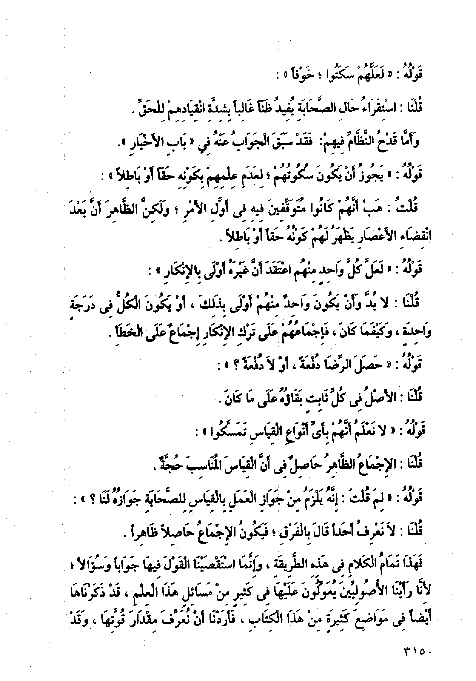 فهذا تمام الكلام في هذه الطريقة، وإنما استقصينا القول فيها جوابًا وسؤالاً؛ لأنَّا رأينا الأصوليين يعولون عليها في كثير من مسائل هذا العلم، قد ذكرناها أيضًا في مواضع كثيرة من هذا الكتاب، فأردنا أن نعرف مقدار قوتها، وقد