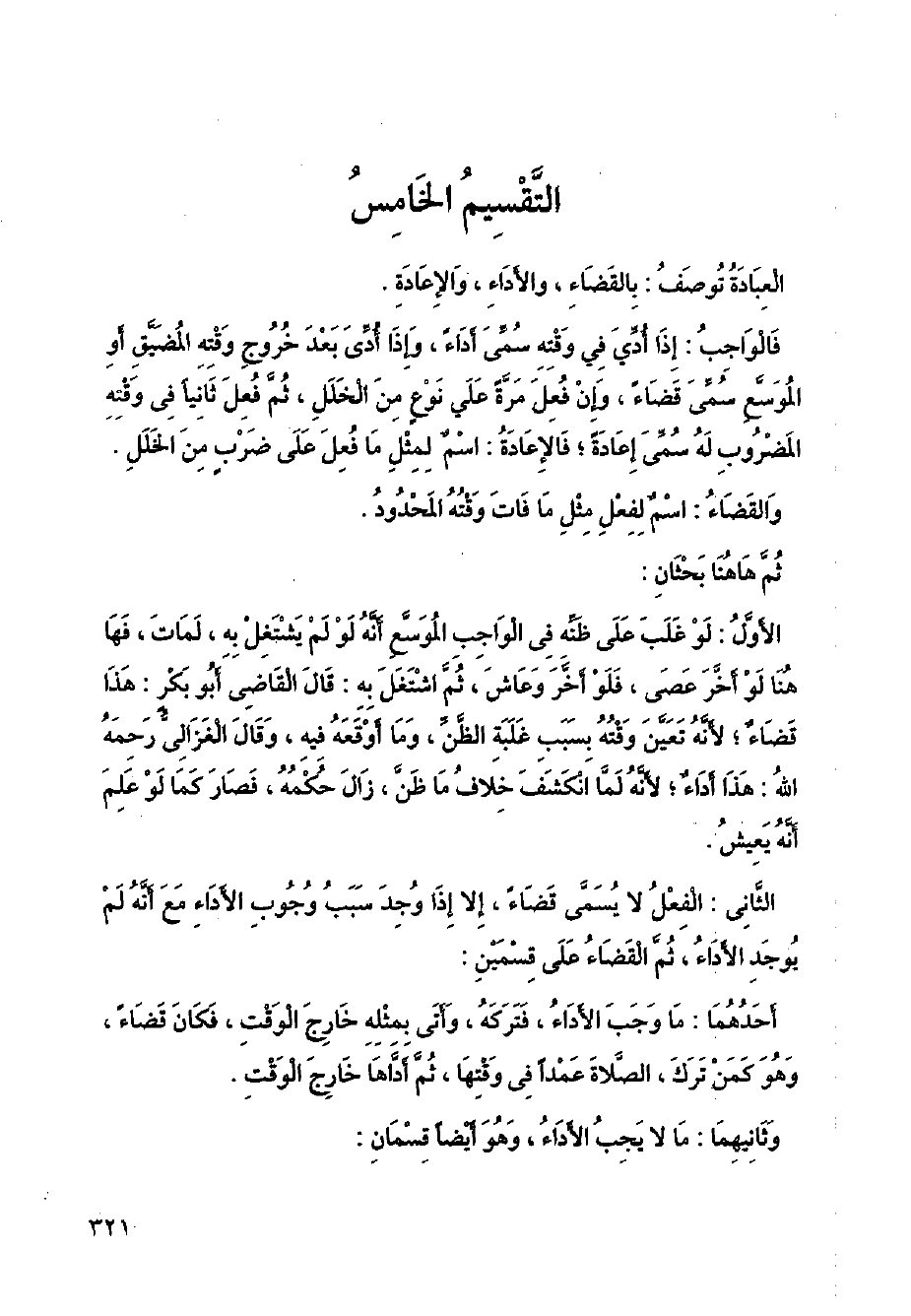 الثاني: الفعل لا يسمى قضاء إلا إذا وجد سبب وجوب الأداء مع أنه لم يوجد الأداء، ثم القضاء على قسمين: