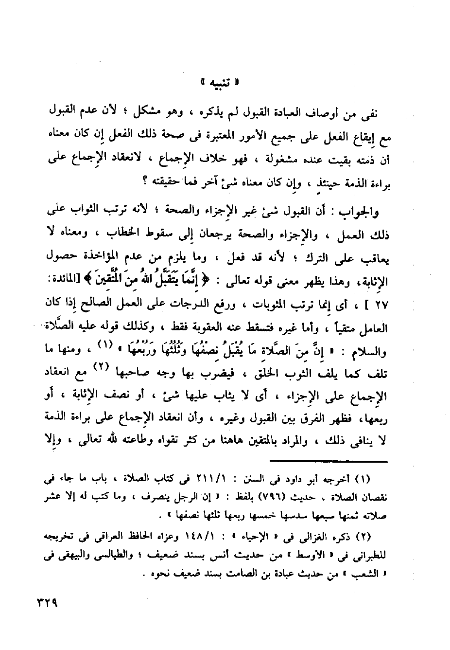 والجواب: أن القبول شيء غير الإجزاء والصحة؛ لأنه ترتب الثواب على ذلك العمل، والإجزاء ولاصحة يرجعان إلى سقوط الخطاب، ومعناه لا يعاقب على الترك؛ لأنه قد فعل، وما يلزم من عدم المؤاخذة حصول الإثابة، وهذا يظهر معنى قوله تعالى: ((إنما يتقبل الله من المتقين)) [المائدة: 27]، أي إنما ترتب المثوبات، ورفع الدرجات على العمل الصالح إذا كان العامل متقيا، وأما غيره فتسقط عنه العقوبة فقط، وكذلك قوله عليه الصلاة والسلام: ((إن من الصلاة ما يقبل نصفها وثلثها وربعها))، ومنها ما تلف كما يلف الثوب الخلق، فيضرب بها وجه صاحبها مع انعقاد الإجماع على الإجزاء، أي لا يثاب عليها شيء، أو نصف الإثابة، أو ربعها، فظهر الفرق بين القبول وغيره، وأن انعقاد الإجماع على براءة الذمة لا ينافي ذلك، والمراد بالمتقين هاهنا من كثر تقواه وطاعته لله تعالى، وإلا