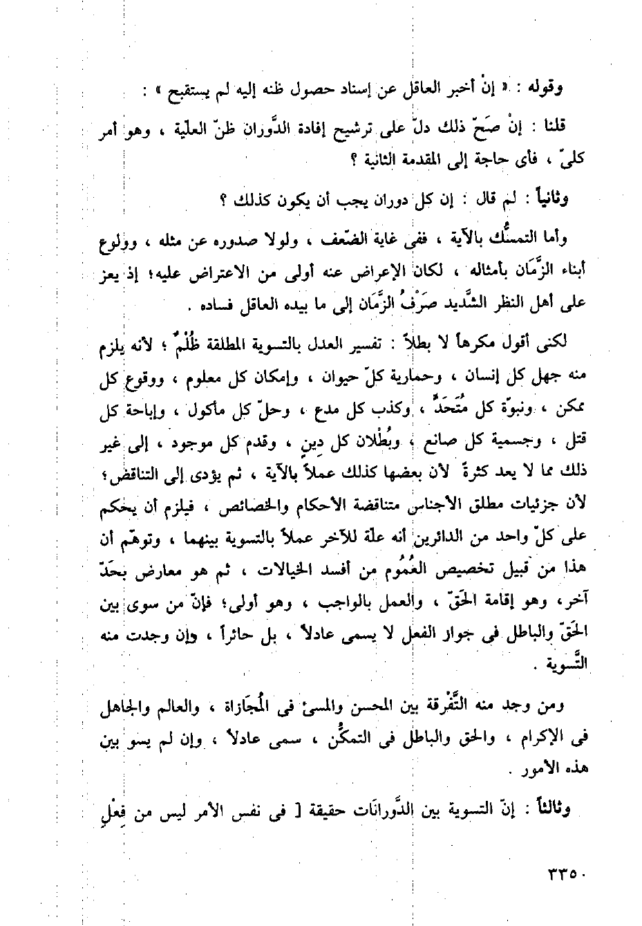 وأما التمسك بالآية، ففي غاية الضعف، ولولا صدوره عن مثله، وولوع أبناء الزمان بأمثاله، لكان الإعراض عنه أولى من الاعتراض عليه؛ إذ يعز على أهل النظر الشديد صرف الزمان إلى ما بيده العاقل فساده.