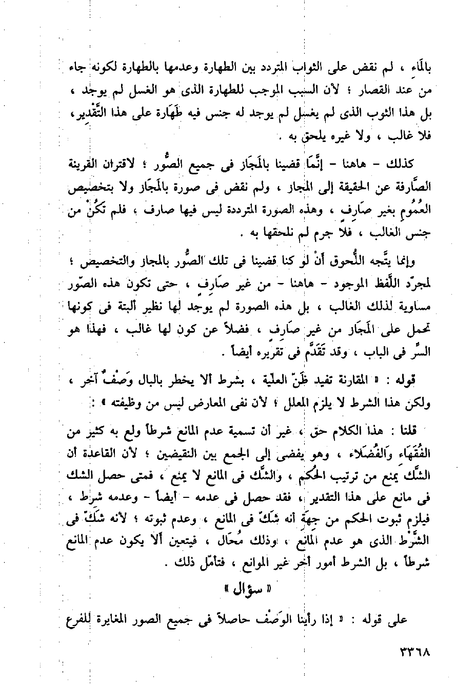 قلنا: هذا الكلام حق، غير أن تسمية عدم المانع شرطا ولع به كثير من الفقهاء والفضلاء، وهو يفضي إلى الجمع بين النقيضين؛ لأن القاعدة أن الشك يمنع من ترتيب الحكم، والشك في المانع لا يمنع، فمتى حصل الشك في مانع على هذا التقدير، فقد حصل في عدمه- أيضا- وعدمه شرط، فيلزم ثبوت الحكم من جهة أنه شك في المانع، وعدم ثبوته؛ لأنه شك في الشرط الذي هو عدم المانع، وذلك محال، فيتعين ألا يكون عدم المانع شرطا، بل الشرط أمور أخر غير الموانع، فتأمل ذلك.