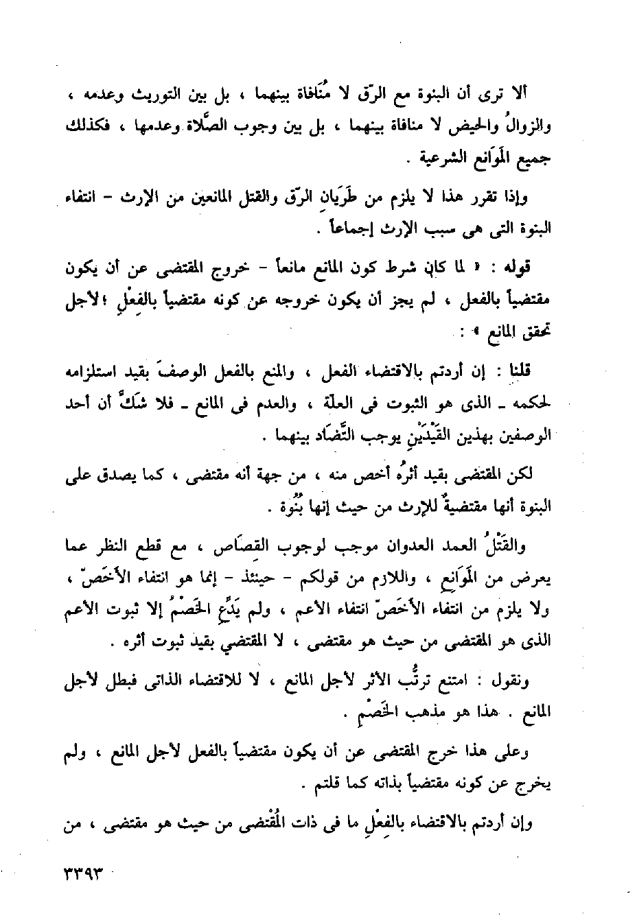 ألا ترى أن البنوة مع الرق لا منافاة بينهما، بل بين التوريث وعدمه، والزوال والحيض لا منافاة بينهما، بل بين وجوب الصلاة وعدمها، فكذلك جميع الموانع الشرعية.