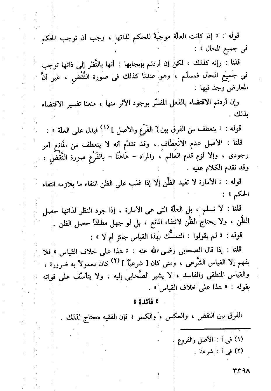 قلنا: الأصل عدم الانعطاف، وقد تقدم أنه لا ينعطف من المانع أمر وجودي، وإلا لزم قدم العالم، والمراد- هاهنا- بالفرع صورة النقض، وقد تقدم الكلام عليه.