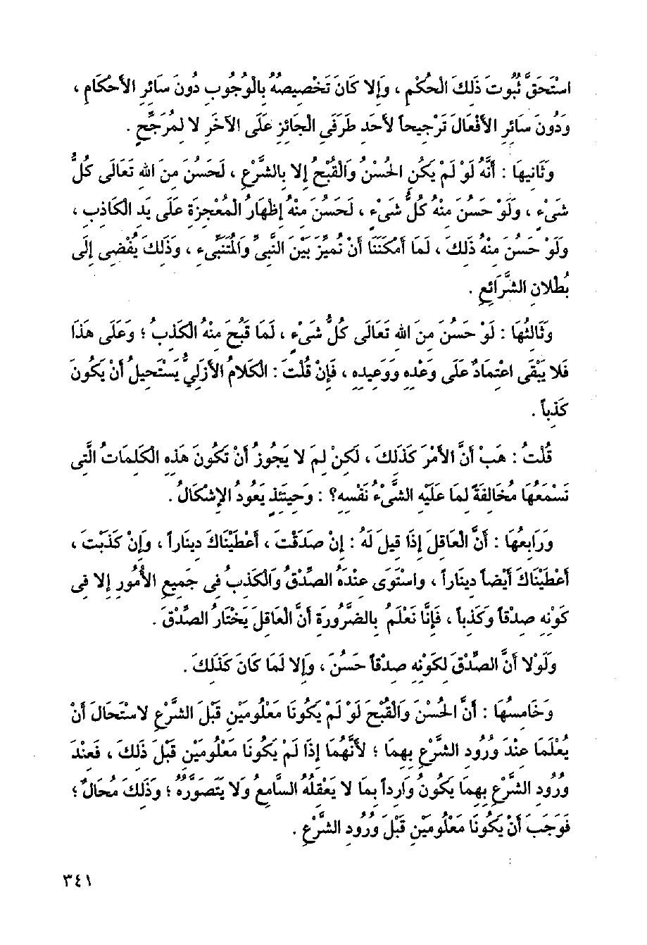 وثانيها: أنه لو لم يكن الحسن والقبح إلا بالشرع، لحسن من الله تعالى كل شيء، ولو حسن منه كل شيء، لحسن منه إظهار المعجزة على يد الكاذب، ولو حسن منه ذلك لما أمكننا أن نميز بين النبي والمتنبيء وذلك يفضي إلى بطلان الشرائع.