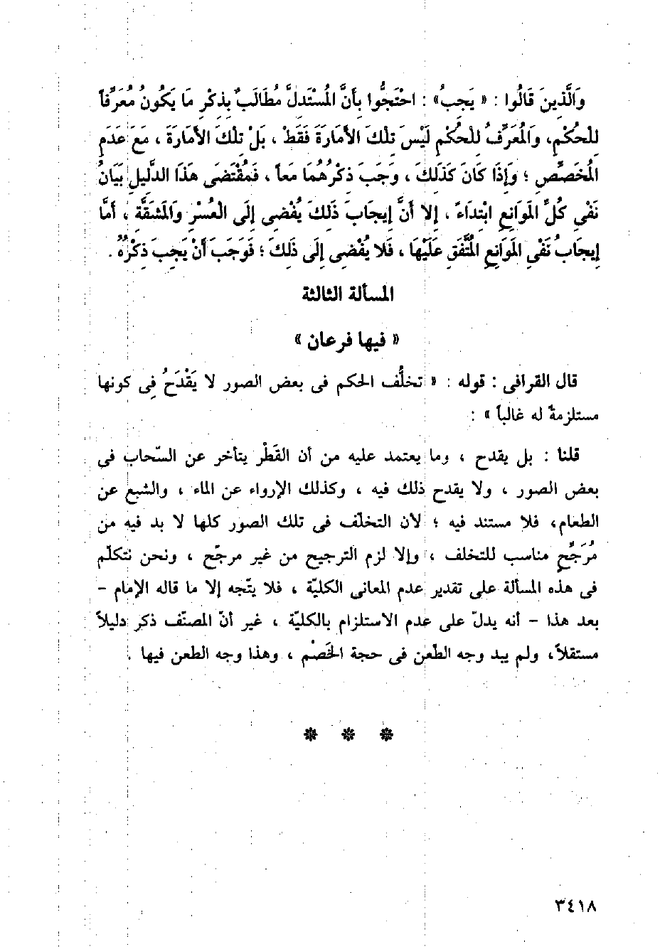 قلنا: بل يقدح، وما يعتمد عليه من أن القطر يتأخر عن السحاب في بعض الصور، ولا يقد ذلك فيه، وكذلك الإرواء عن الماء، والشبع عن الطعام، فلا مستند فيه؛ لأن التخلف في تلك الصور كلها لابد فيه من مرجح مناسب للتخلف، وإلا لزم الترجيح من غير مرجح، ونحن نتكلم في هذه المسألة على تقدير عدم المعاني الكلية، فلا يتجه إلا ما قاله الإمام- بعد هذا- أنه يدل على عدم الاستلزام بالكلية، غير أن المصنف ذكر دليلا مستقلا، ولم يبد وجه الطعن في حجة الخصم، وهذا وجه الطعن فيها.