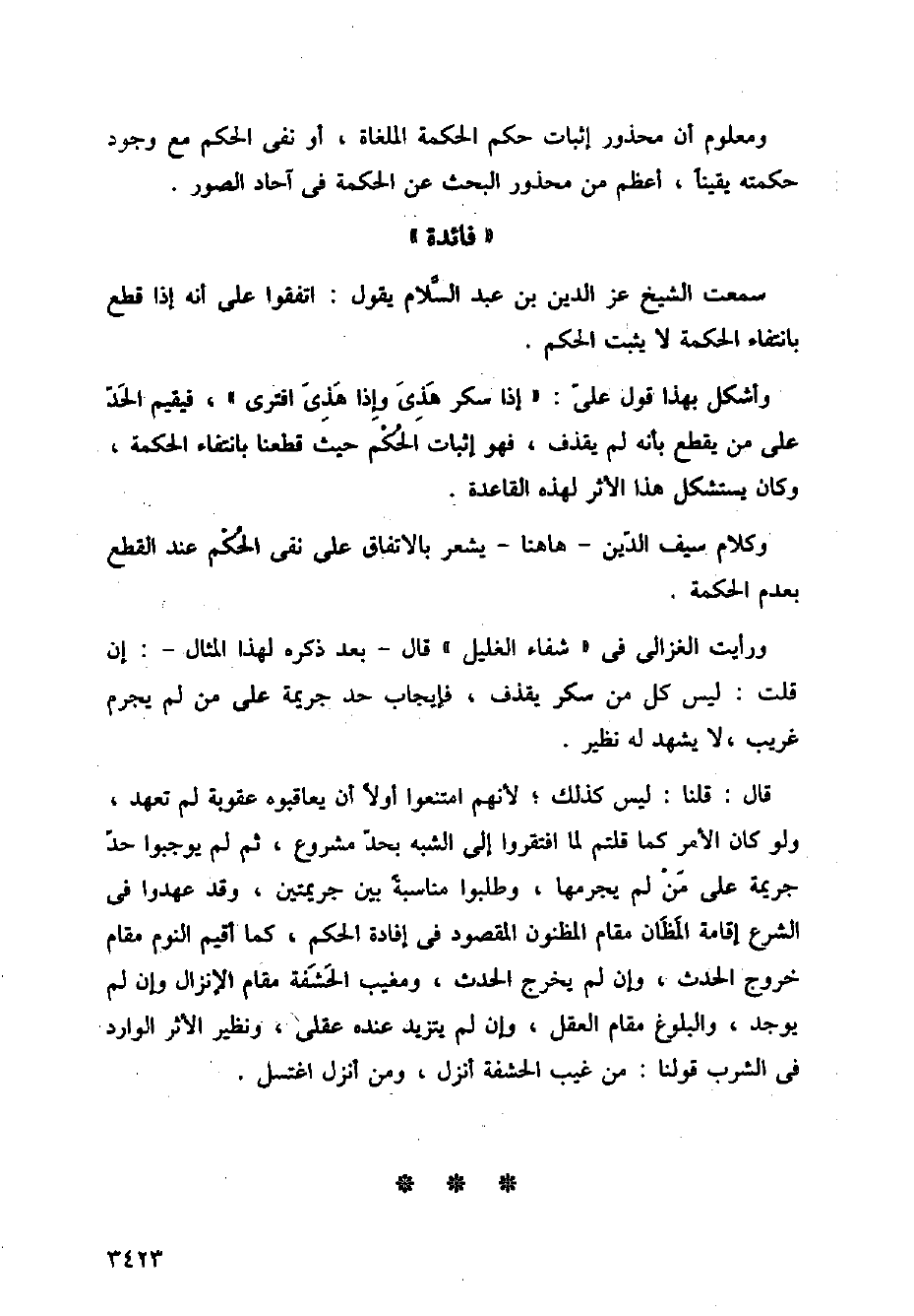 ورأيت الغزالي في (شفاء الغليل) قال- بعد ذكره لهذا المثال-: إن قلت: ليس كل من سكر يقذف، فإيجاب حد جريمة على من لم يجرم غريب، لا يشهد له نظير.