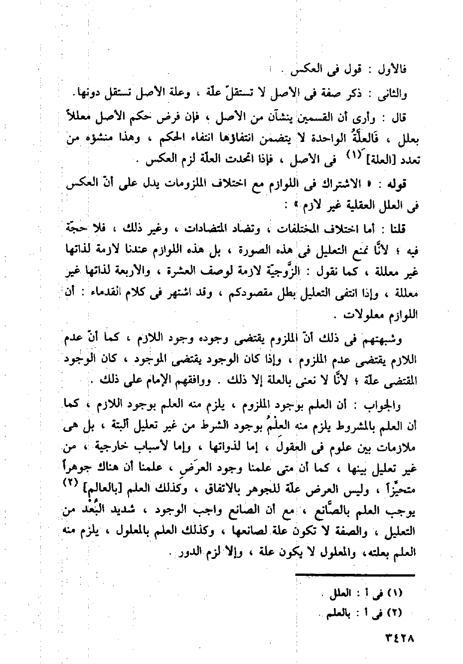 والجواب: أن العلم بوجود الملزوم، يلزم منه العلم بوجود اللازم، كما أن العلم بالمشروط يلزم منه العلم بوجود الشرط من غير تعليل ألبتة، بل هي ملازمات بين علوم في العقول، إما لذواتها، وإما لأسباب خارجية، من غير تعليل بينها، كما أن متى علمنا وجود العرض، علمنا أن هناك جوهرا متحيزا، وليس العرض علة للجوهر بالاتفاق، وكذلك العلم [بالعالم] يوجب العلم بالصانع، مع أن الصانع واجب الوجود، شديد البعد من التعليل، والصفة لا تكون علة لصانعها، وكذلك العلم بالمعلول، يلزم منه العلم بعلته؛ والمعلول لا يكون علة، وإلا لزم الدور.