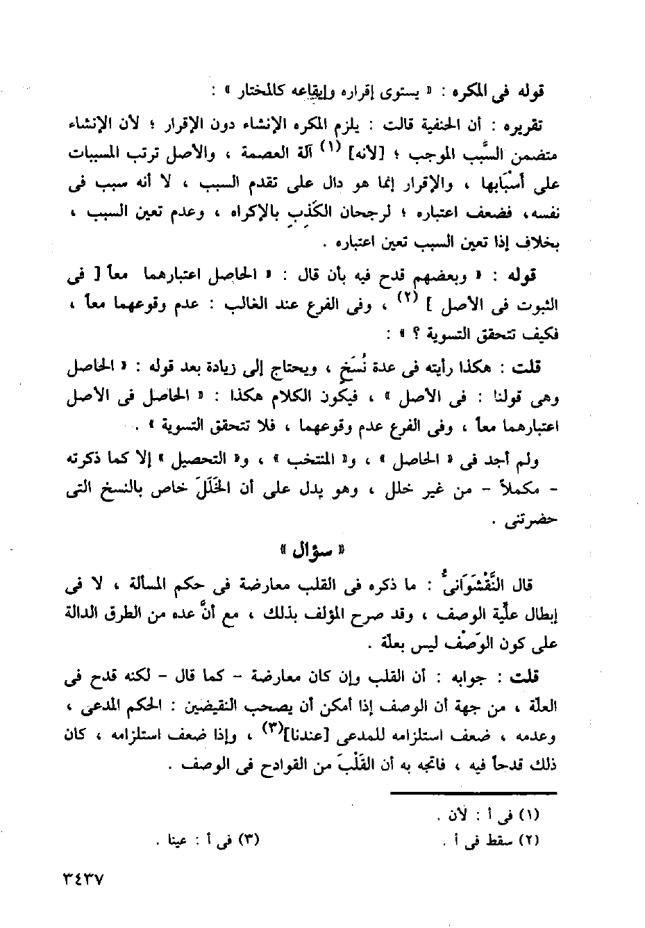 تقريره: أن الحنفية قالت: يلزم المكره الإنشاء دون الإقرار؛ لأن الإنشاء متضمن السبب الموجب؛ [لأنه] آلة العصمة، والأصل ترتب المسببات على أسبابها، والإقرار إنما هو دال على تقدم السبب، لا أنه سبب في نفسه، فضعف اعتباره؛ لرجحان الكذب بالإكراه، وعدم تعين السبب، بخلاف إذا تعين السبب تعين اعتباره.