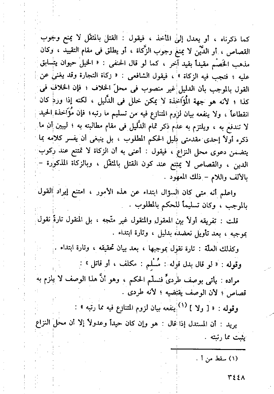 كما ذكرناه، أو يعدل إلى المأخذ، فيقول: القتل بالمثقل لا يمنع وجوب القصاص، أو الدين لا يمنع وجوب الزكاة، أو يطلق في مقام التقييد، وكان مذهب الخصم مفيدا بقيم آخر، كما لو قال الحنفي، "الخيل حيوان يتسابق عليه؛ فتجب عليه الزكاة"، فيقول الشافعي: "زكاة التجارة وقد يغنى عن القول بالموجب بأن الدليل غير منصوب في محل الخلاف؛ فإن الخلاف في كذا؛ لأنه هو جهة المؤاخذة لا يمكن خلل في الدليل، لكنه إذا ورد كان انقطاعا، ولا ينفعه بيان لزوم المتنازع فيه من تسليم ما رتبه؛ فإن مؤاخذة الجيد لا تندفع به، ويلتزم به عدم ذكر تمام الدليل في مقام مطالبته به؛ ليبين أن ما ذكره أولا إحدى مقدمتي دليل الحكم المطلوب، يل ينبغي أن يسفر كلامه بما يتضمن دعوى محل النزاع، فقول: أعنى به أن الزكاة لا تمتنع عند ركوب الدين، والقصاص لا يمتنع عند كون القتل بالمثقل، وبالزكاة المذكورة- بالألف واللام- ذلك المعهود.
