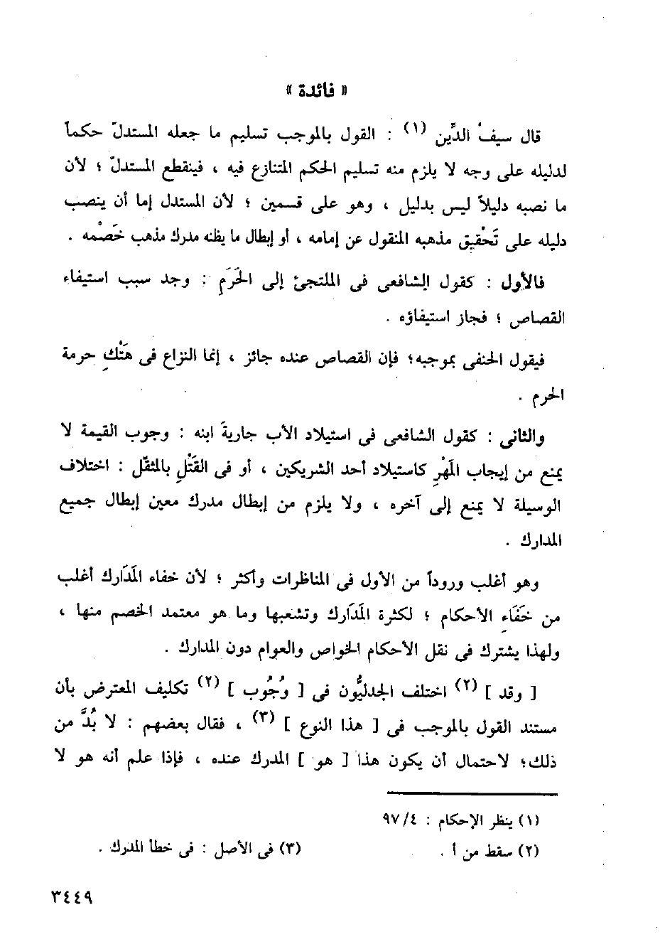 قال سيف الدين: القول بالموجب تسليم ما جعله المستدل حكما لدليله على وجه لا يلزم منه تسليم الحكم المتنازع فيه، فينقطع المستدل؛ لأن ما نصبه دليلا ليس بدليل، وهو على قسمين؛ لأن المستدل إما أن ينصب دليله على تحقيق مذهبه المنقول عن إمامه، أو إبطال ما يظنه مدرك مذهب خصمه.