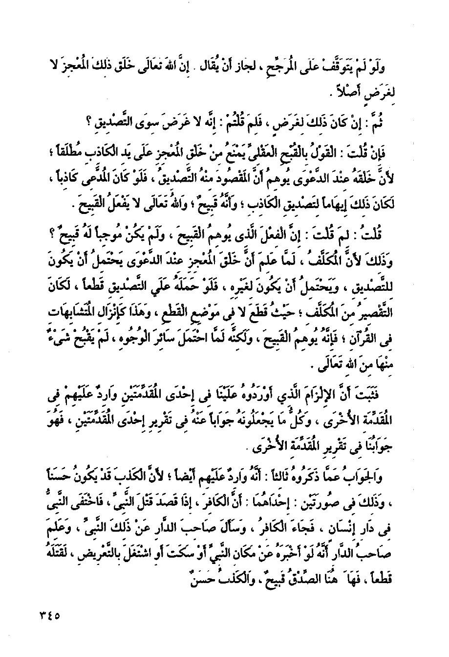 فإن قلت القول بالقبح العقلي يمنع من خلق المعجز على يد الكاذب مطلقا، لأن خلقه عند الدعوى يوهم أن المقصود منه التصديق فلو كان المدعي كاذبا لكان ذلك ايهاما لتصديق الكاذب وإنه قبيح والله تعالى لا يفعل القبيح.