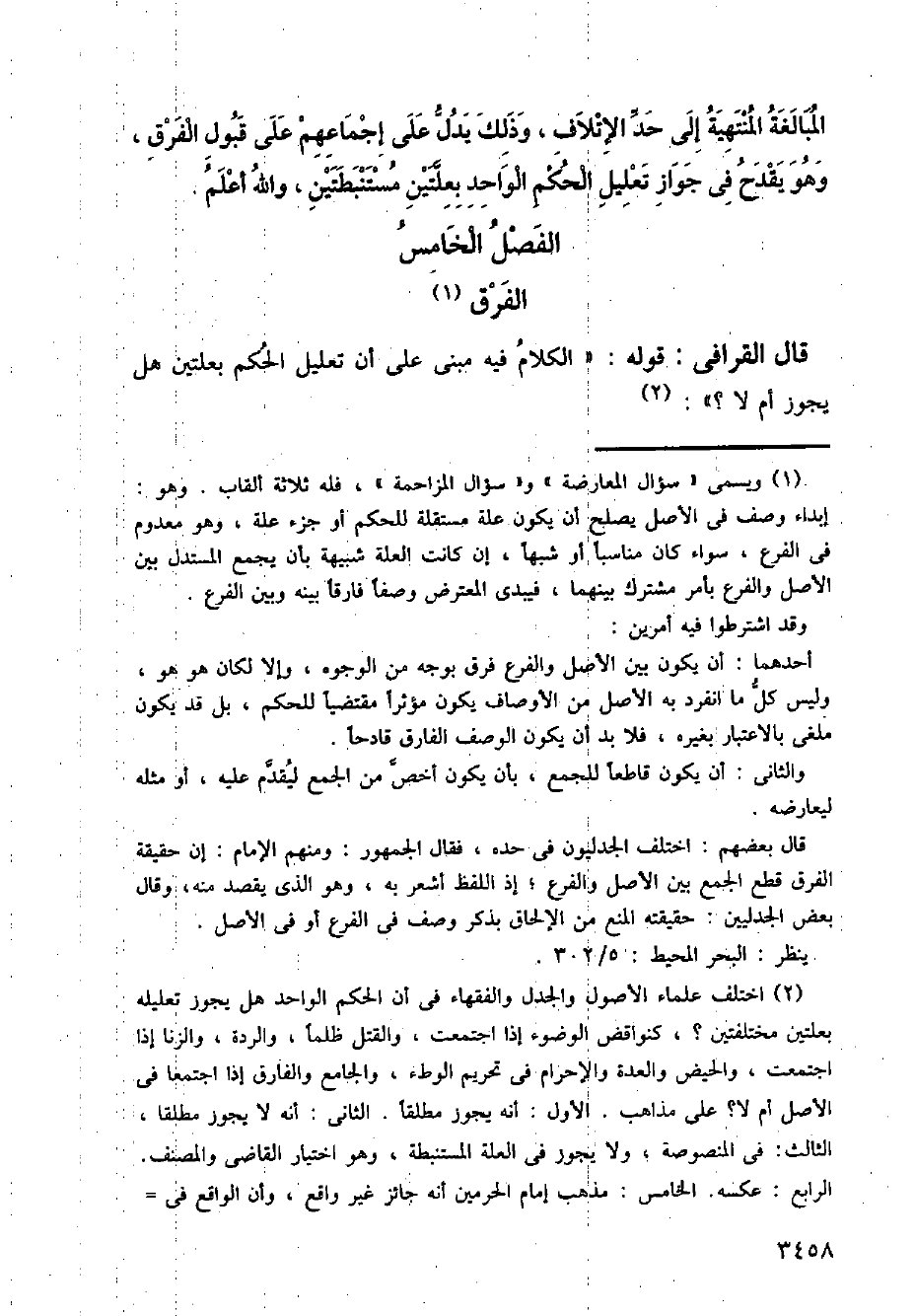قال القرافي: قوله: "الكلام فيه مبنى على أن تعليل الحكم بعلتين هل يجوز أم لا؟ ":