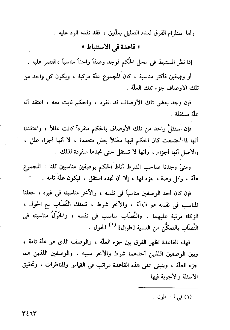 فإن كان احد الوصفين مناسبا في نفسه، والآخر مناسبته في غيره، جعلنا المناسب في نفسه هو العلة، والآخر شرط، كملك النصاب مع الحول، الزكاة متربة عليهما، والنصاب مناسب في نفسه، والحول مناسبته في النصاب بالتمكن من التنمية [طوال] الحول.