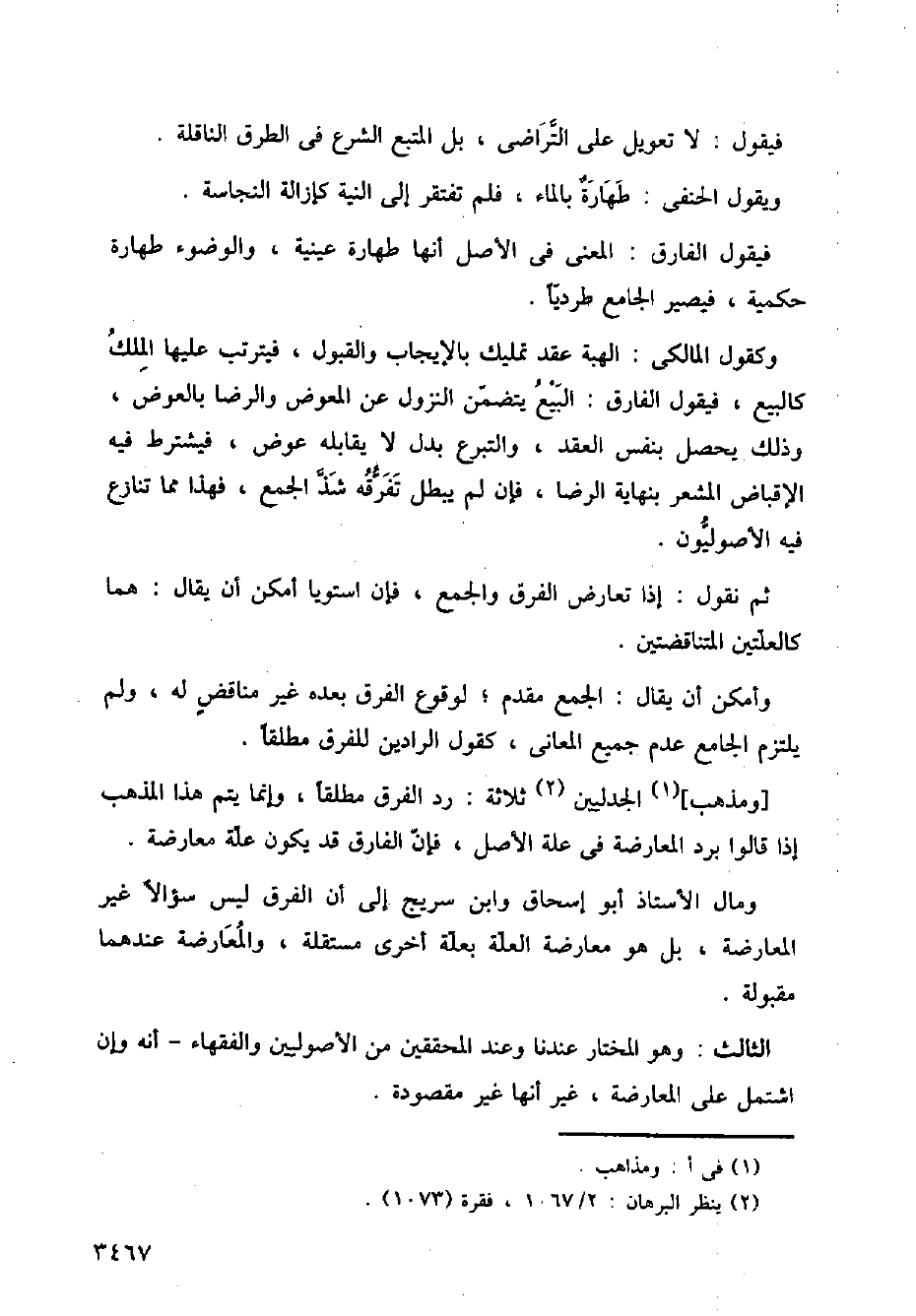 وكقول المالكي: الهبة عقد تمليك بالإيجاب والقبول، فيترتب عليها الملك كالبيع، فيقول الفارق: البيع يتضمن النزول عن المعوض والرضا بالعوض، وذلك يحصل بنفس العقد، والتبرع بدل لا يقابله عوض، فيشترط فيه الإقباض المشعر بنهاية الرضا، فإن لم يبطل تفرقه شذ الجمع، فهذا مما تنازع فيه الأصوليون.