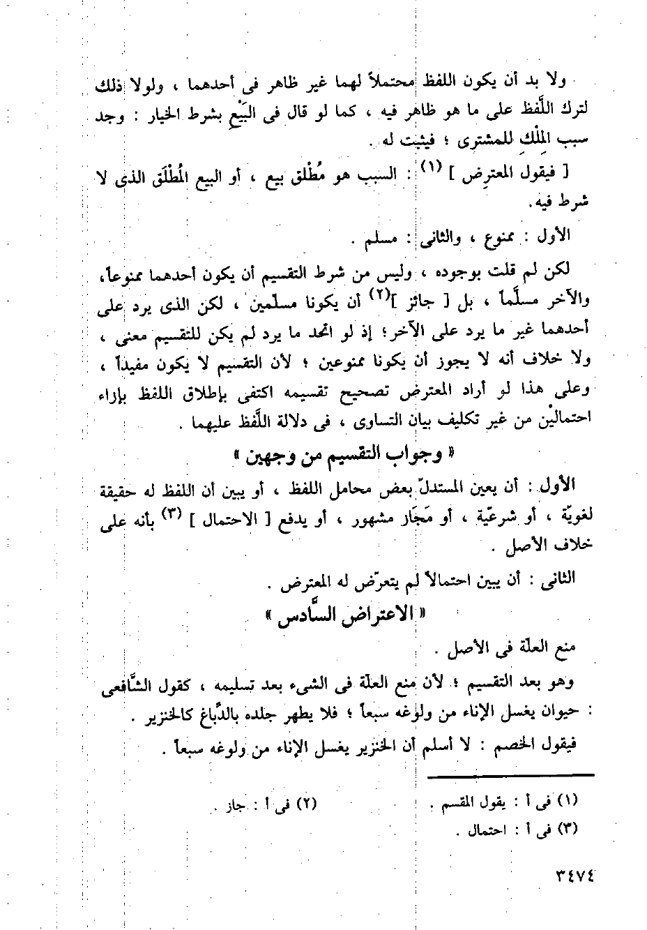لكن لم قلت بوجوده، وليس من شرط التقسيم أن يكون أحدهما ممنوعا، والآخر مسلما، بل [جائز] أن يكونا مسلمين، لكن الذي يرد على أحدهما غير ما يرد على الآخر؛ إذا لو اتحد ما يرد لم يكن للتقسيم معنى، ولا خلاف أنه لا يجوز أن يكونا ممنوعين؛ لأن التقسيم لا يكون مفيدا، وعلى هذا لو أراد المعترض تصحيح تقسيمه اكتفى بإطلاق اللفظ بإزاء احتمالين من غير تكليف بيان التساوي، في دلالة اللفظ عليهما.