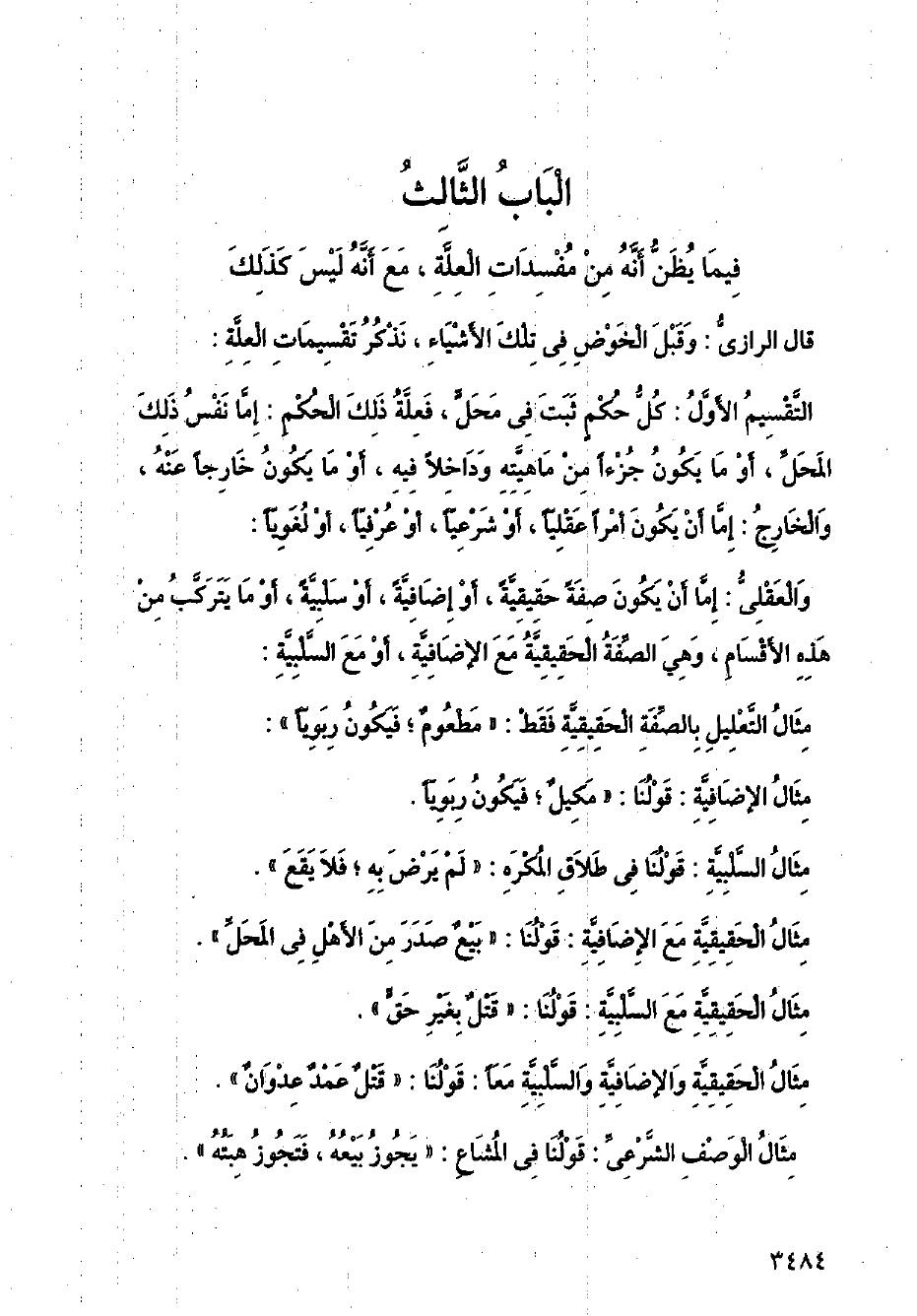 التقسيم الأول: كل حكم ثبت في محل، فعلة ذلك الحكم: إما نفس ذلك المحل، أو ما يكون جزءا من ماهيته وداخلا فيه، أو ما يكون خارجا عنه، والخارج: إما أن يكون أمرا عقليا، أو شرعيا، أو عرفيا، أو لغويا: